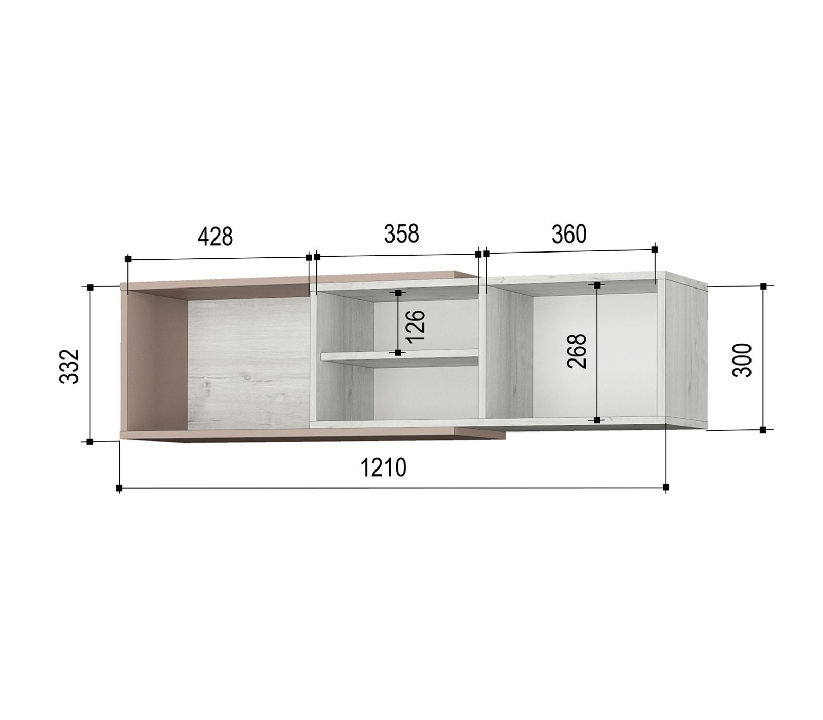 Корпус: ЛДСП 16 мм, класс эмиссии Е1, цвет «Дуб Эльза», «Мокко». Кромка ПВХ 0,45 и 2 мм. Задняя стенка ДВП окрашена в белый цвет, ЛДСП 16 мм в цвете «Дуб Эльза».