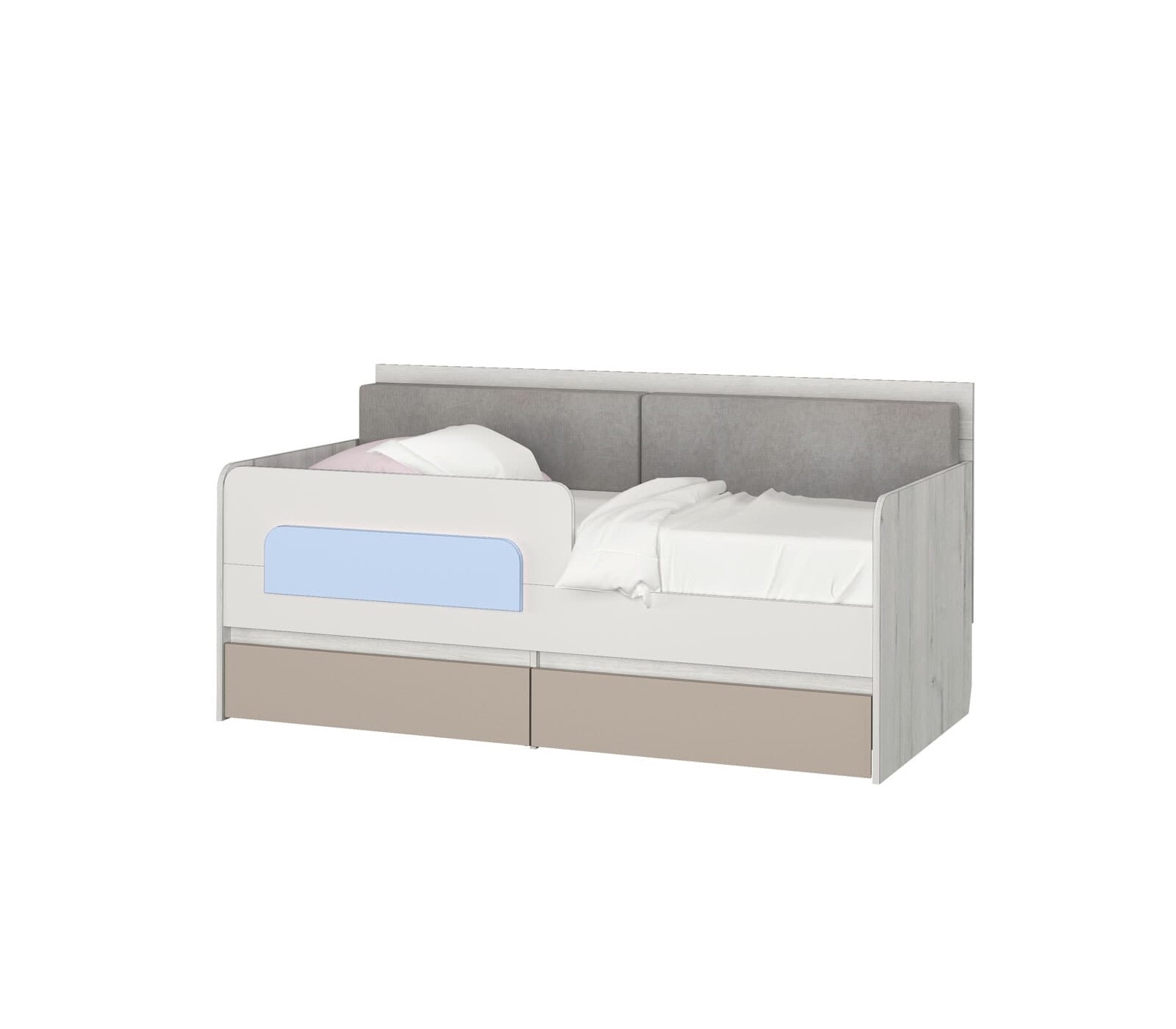 Односпальная кровать-тахта Зефир голубой с подушками и защитным бортиком одноименной яркой серии.