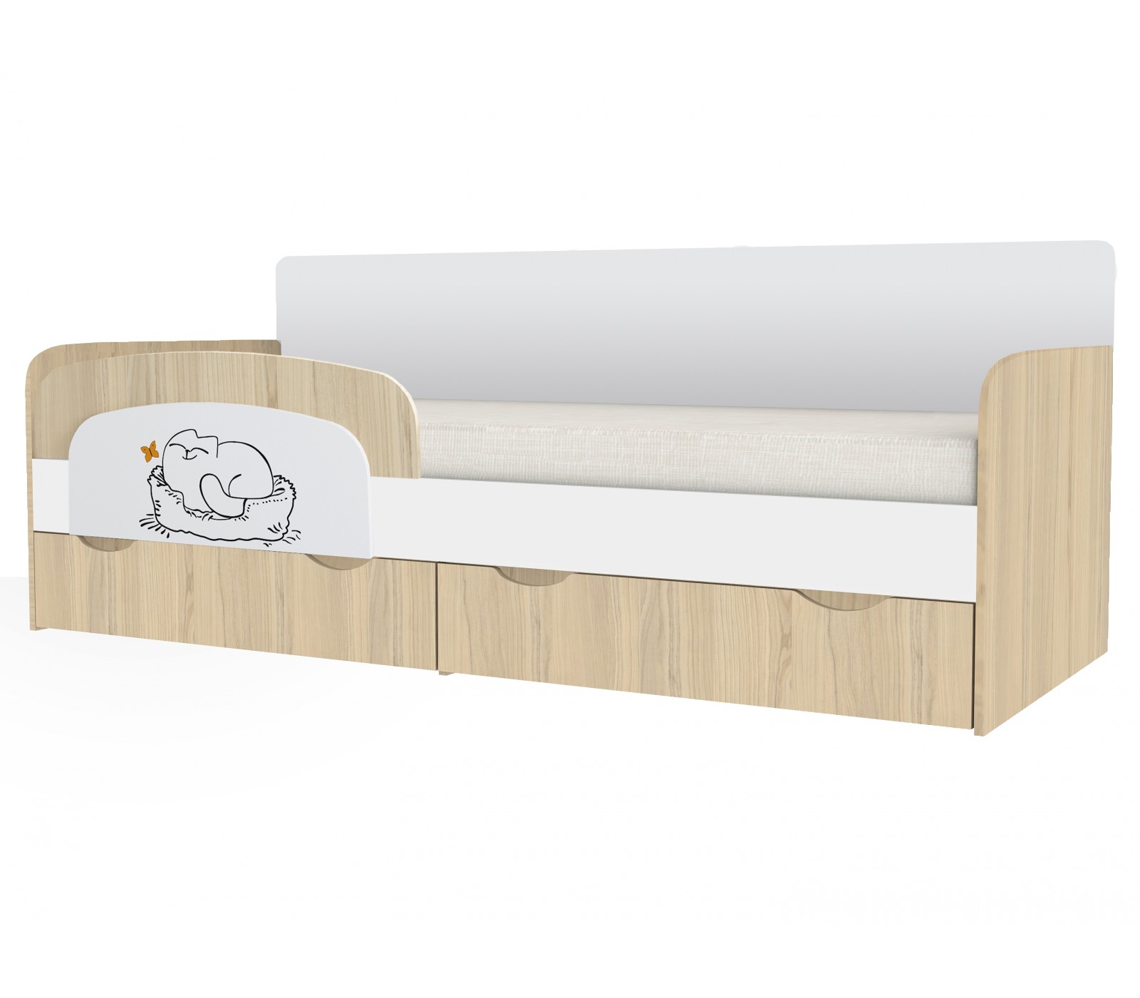 Для удобства хранения вещей укомплектована двумя ящиками. Ящики на шариковых направляющих. Для безопасности Вашего ребенка все кромки ЛДСП скругленные. Кровать-тахта Кот имеет жесткое основание для матраса.