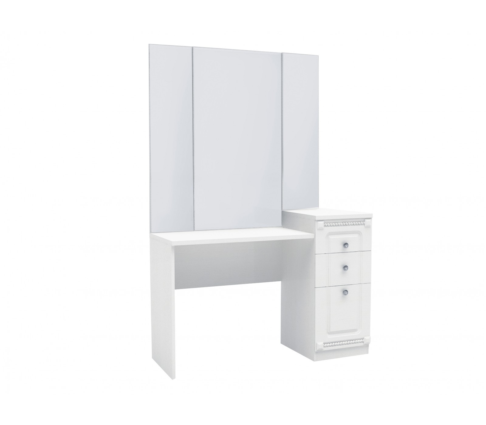 Корпус ЛДСП 16 и 22 мм. Фасады МДФ 16 мм. с фрезеровкой и зеркало 4 мм. Ручки металлические со стразами. Три выкатных ящика.