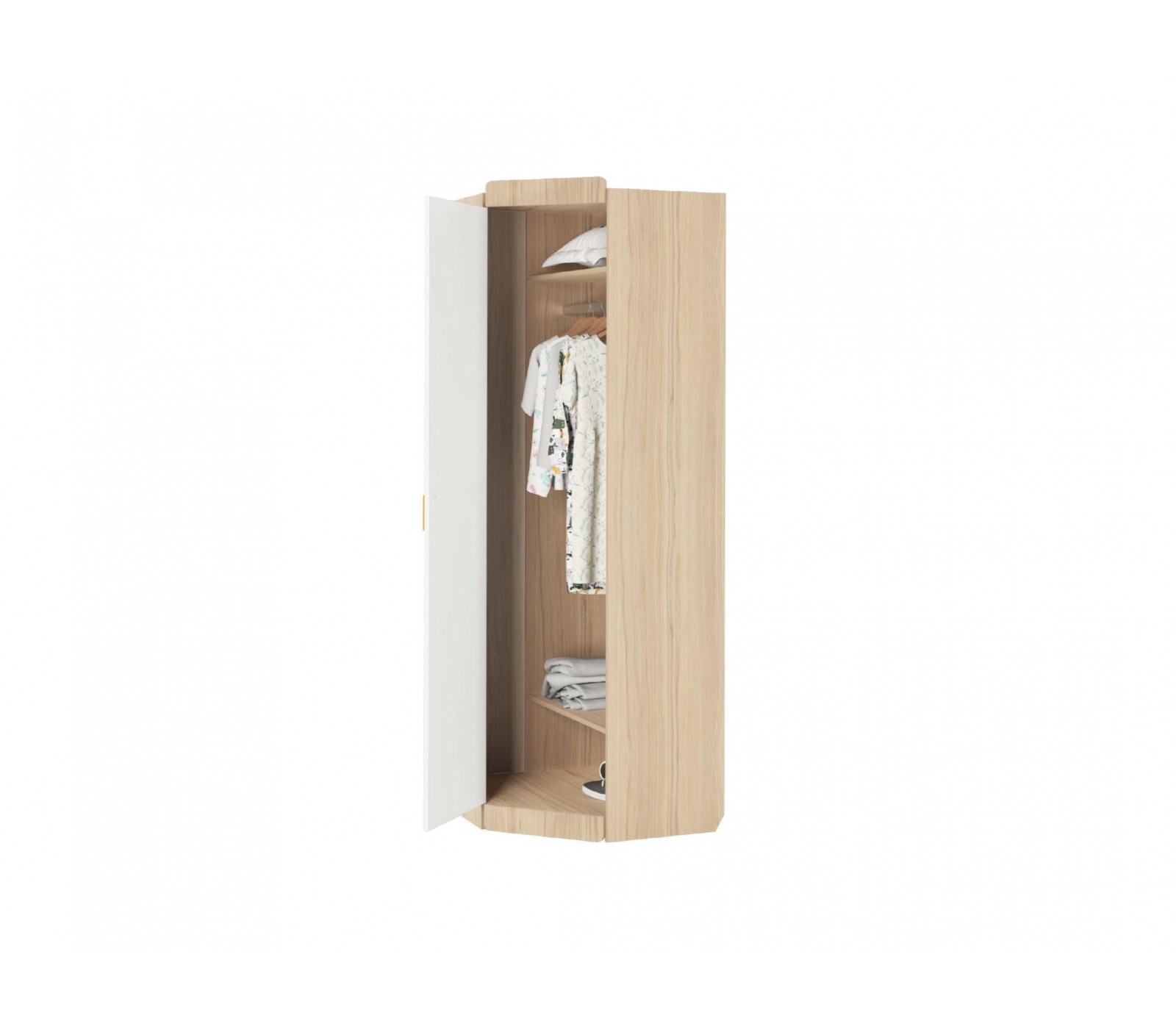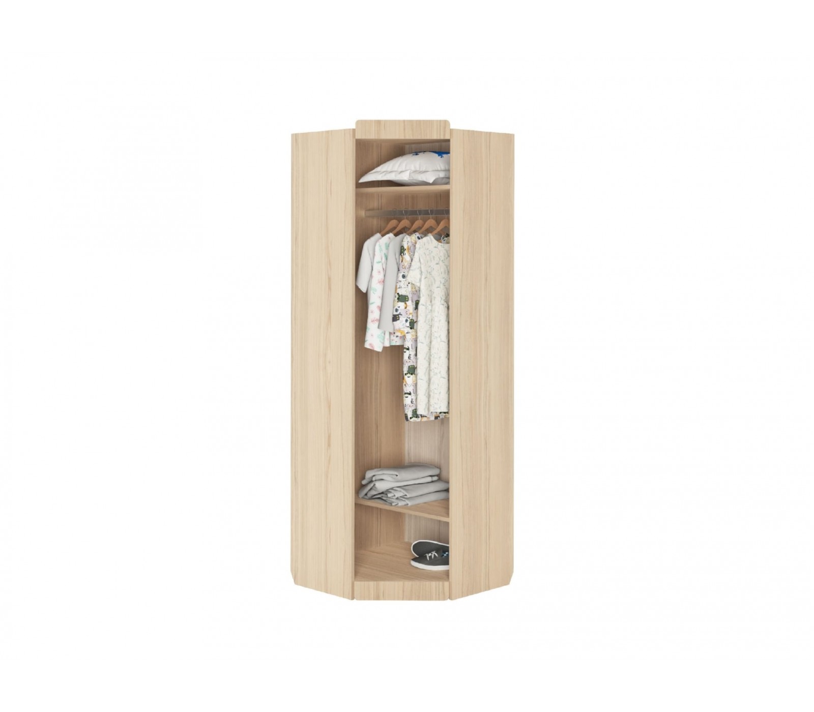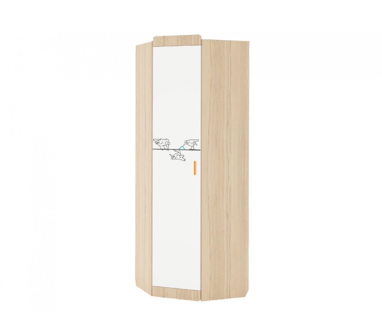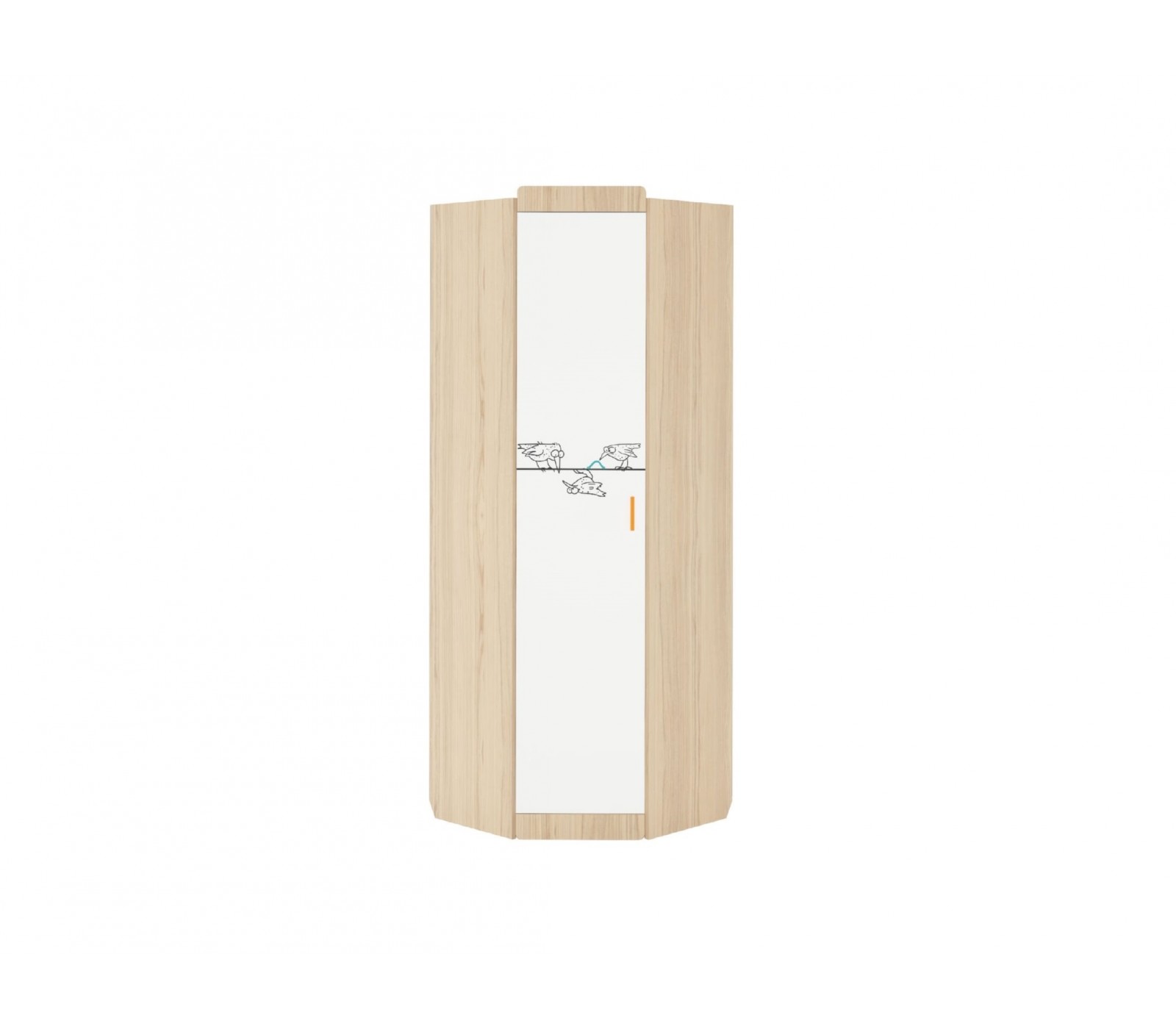 Шкаф угловой серии "Кот" для горизонтального хранения вещей. Комплектуется ручками двух цветов. На внутренней части дополнительно размещены два крючка. На фасадах принты выполнены способом Ультрафиолетовой печати.