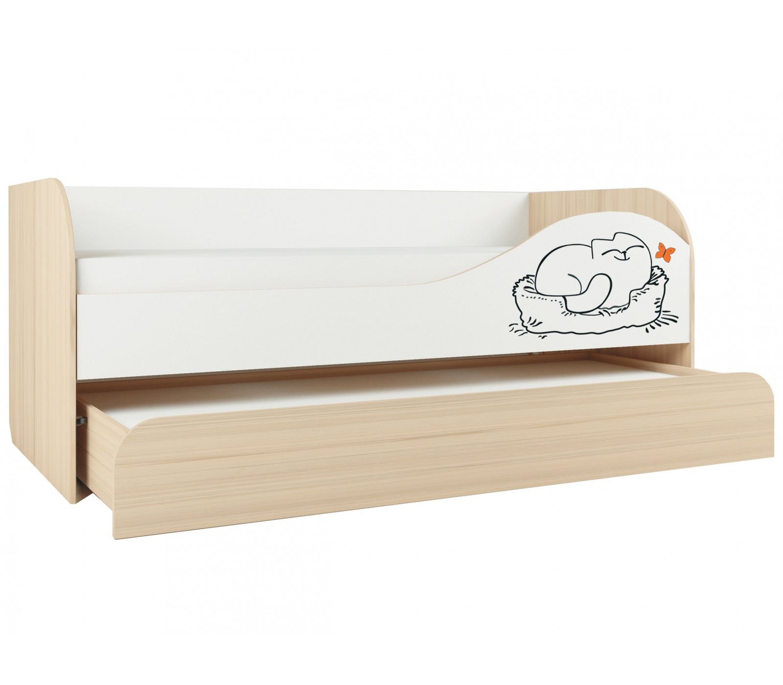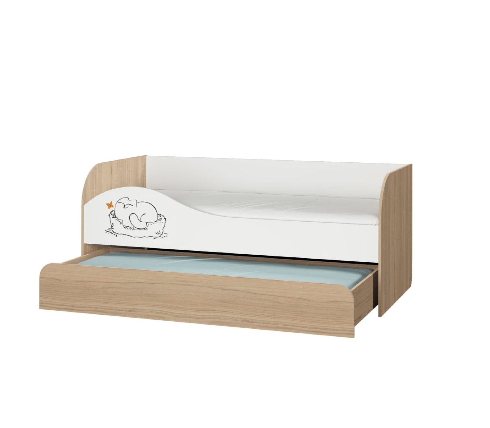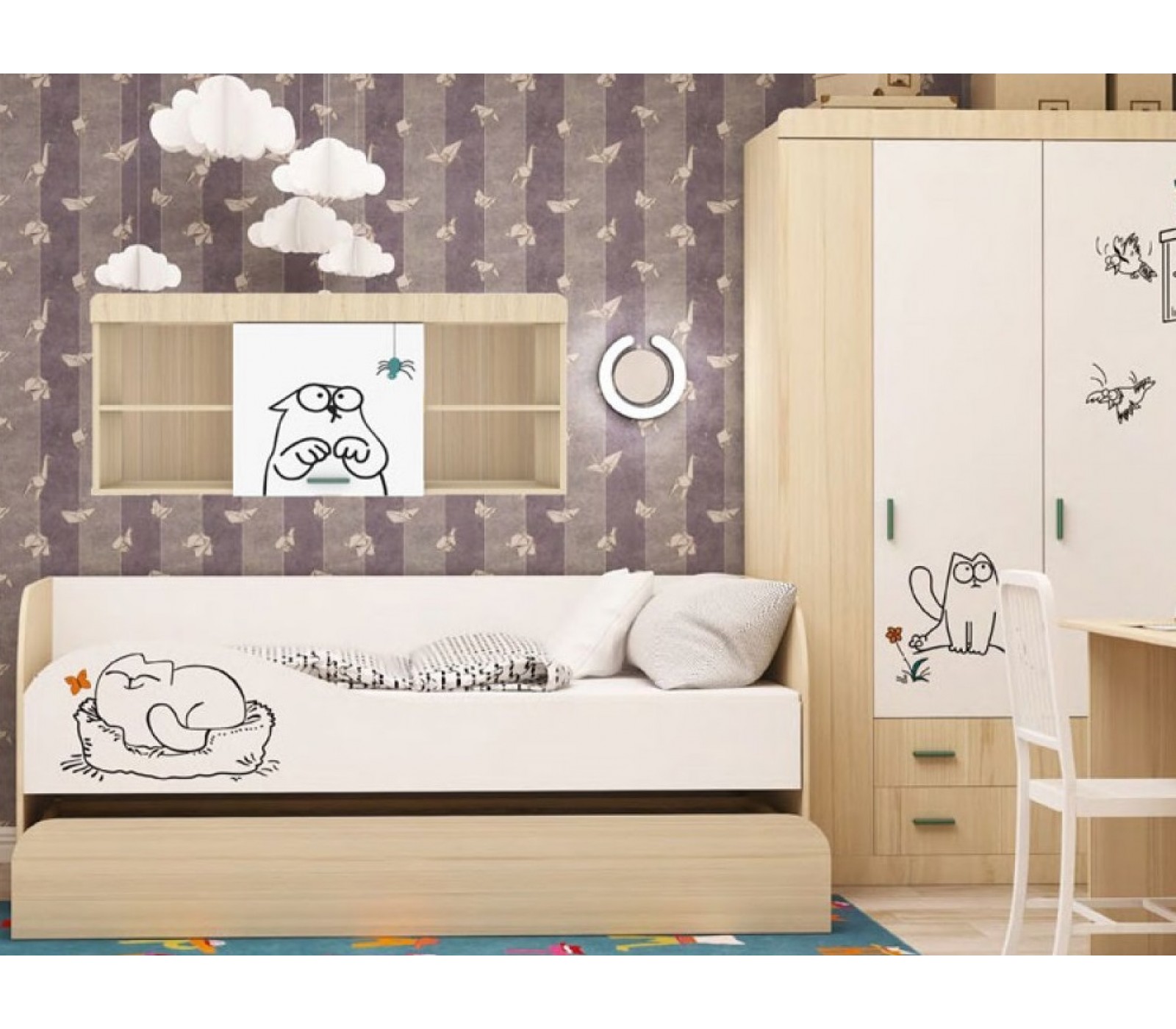 Двухуровневая кровать Кот с изображением кота Саймона радость для Ваших детей. Стационарное верхнее спльное место и выдвижное нижнее. Также удобно для размещение гостей Вашего ребенка. Качественные и экологичные материалы без посторонних запахов. Мебель имеет скругленные углы для безопасности. Надежная фурнитура. Нижняя часть выдвигается на двух колесиках по стационарным салазкам. Для нижнего спального места отлично подойдет Матрас Оптима Детский высотой 12 см.