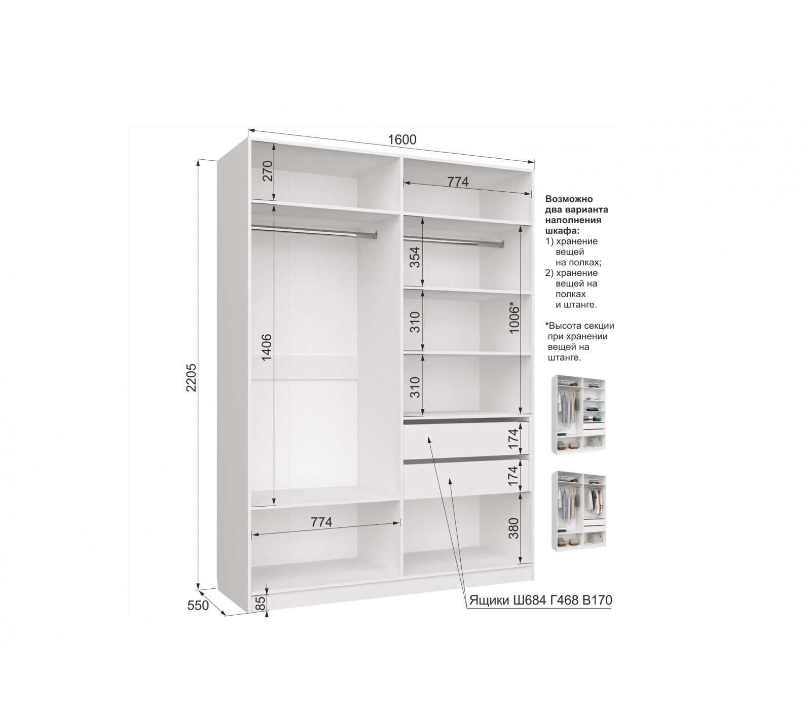 Размеры, Ширина-Высота-Глубина мм: 1600 x 550 x 2200