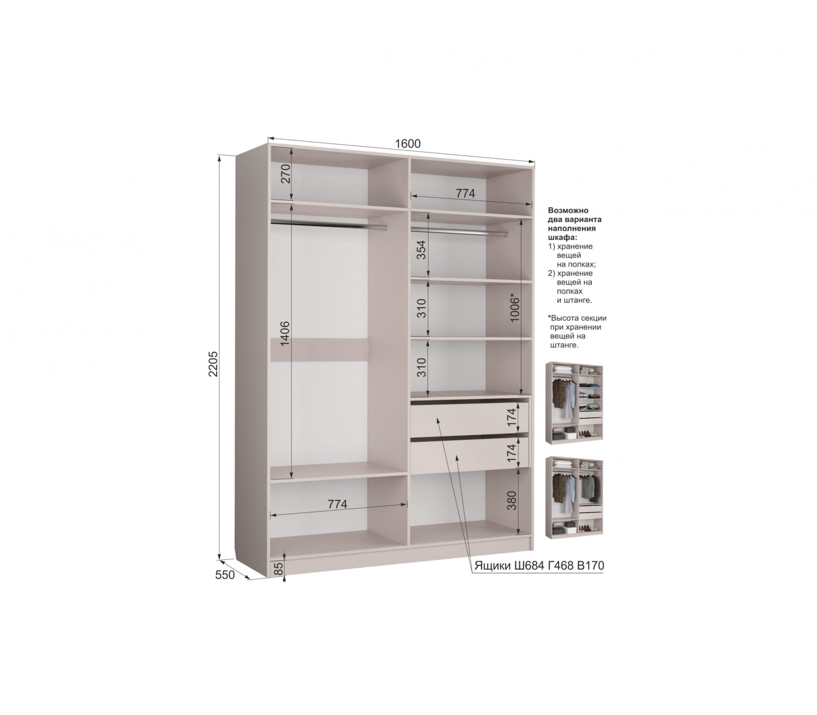 Размеры, Ширина-Высота-Глубина мм: 1600 x 550 x 2200