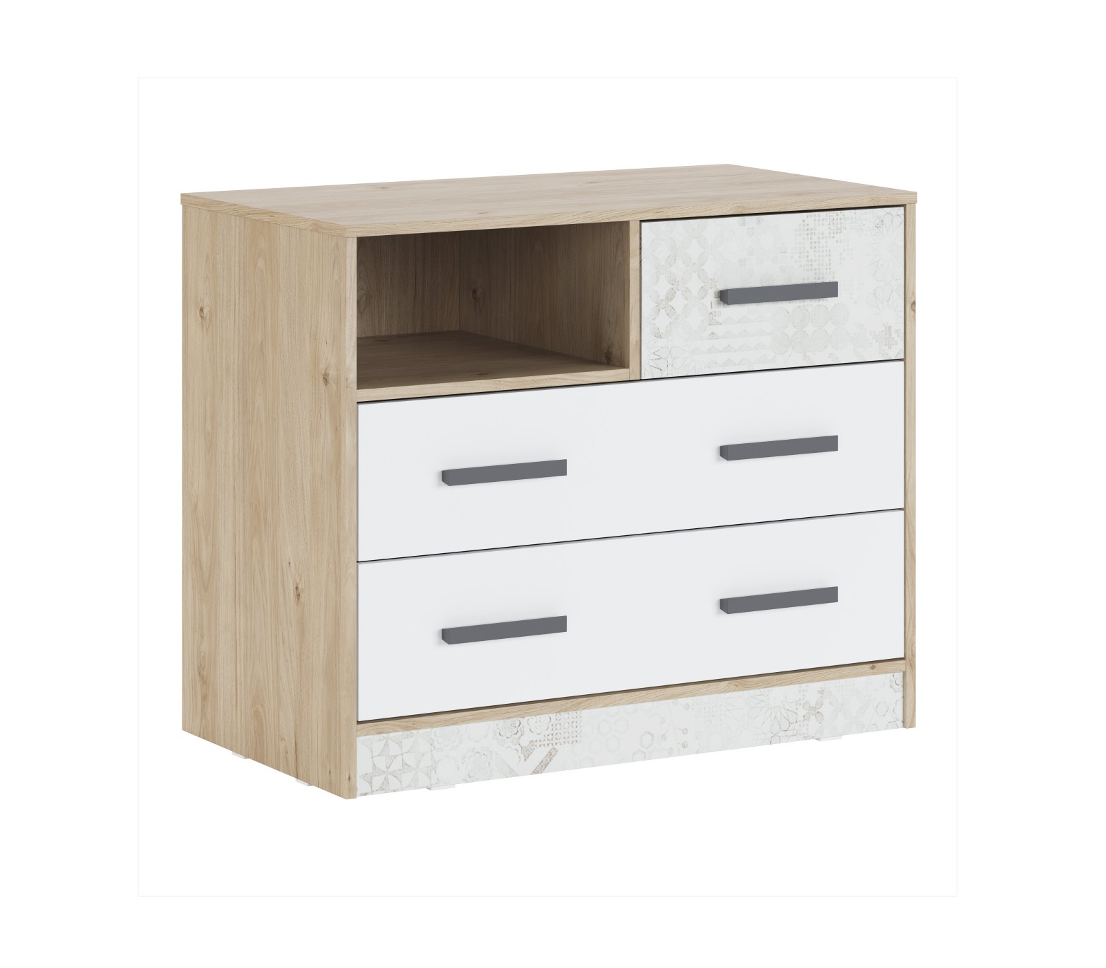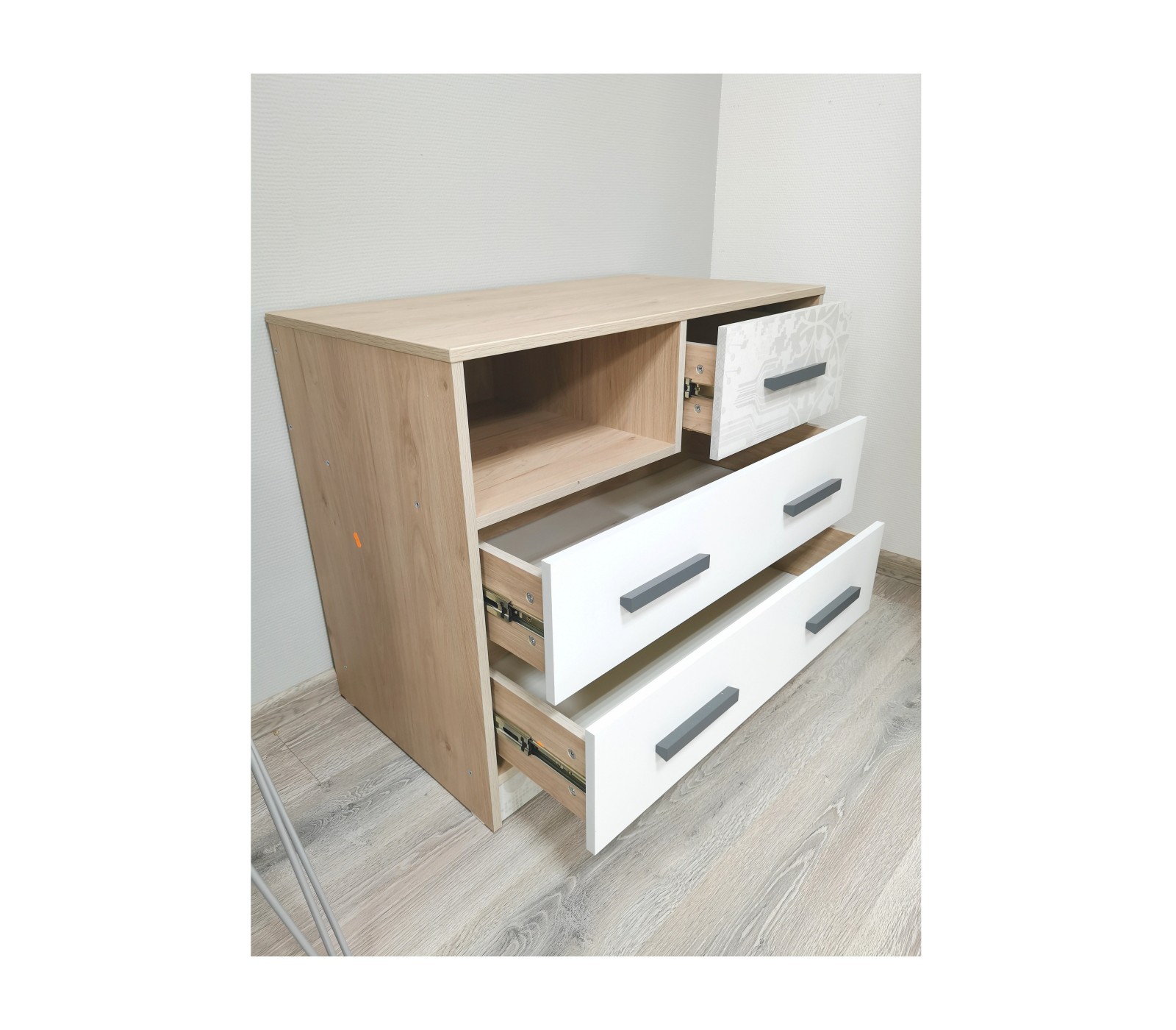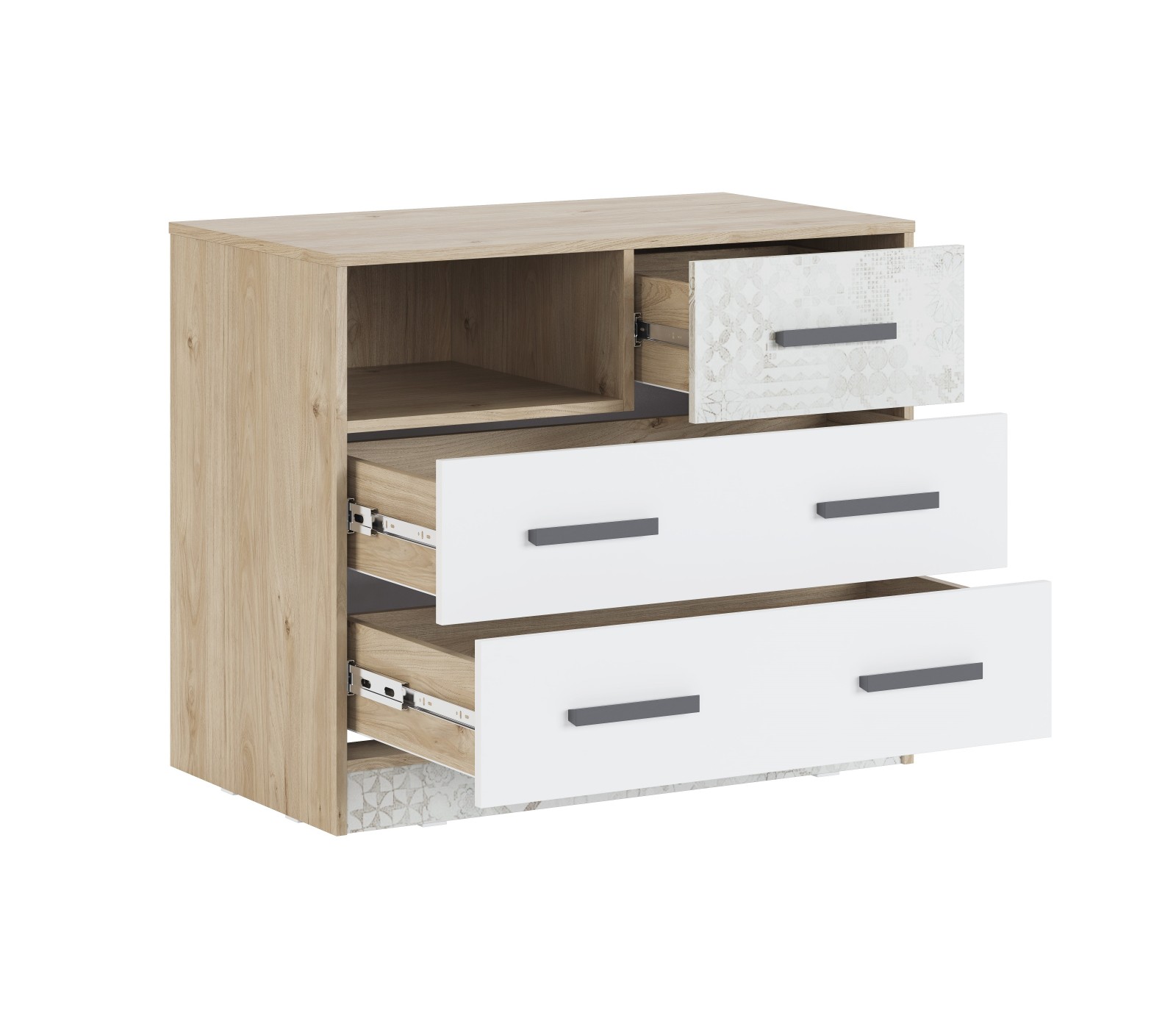 Комод имеет три выдвижных ящика на шариковых направляющих полного выдвижения и открытую нишу.