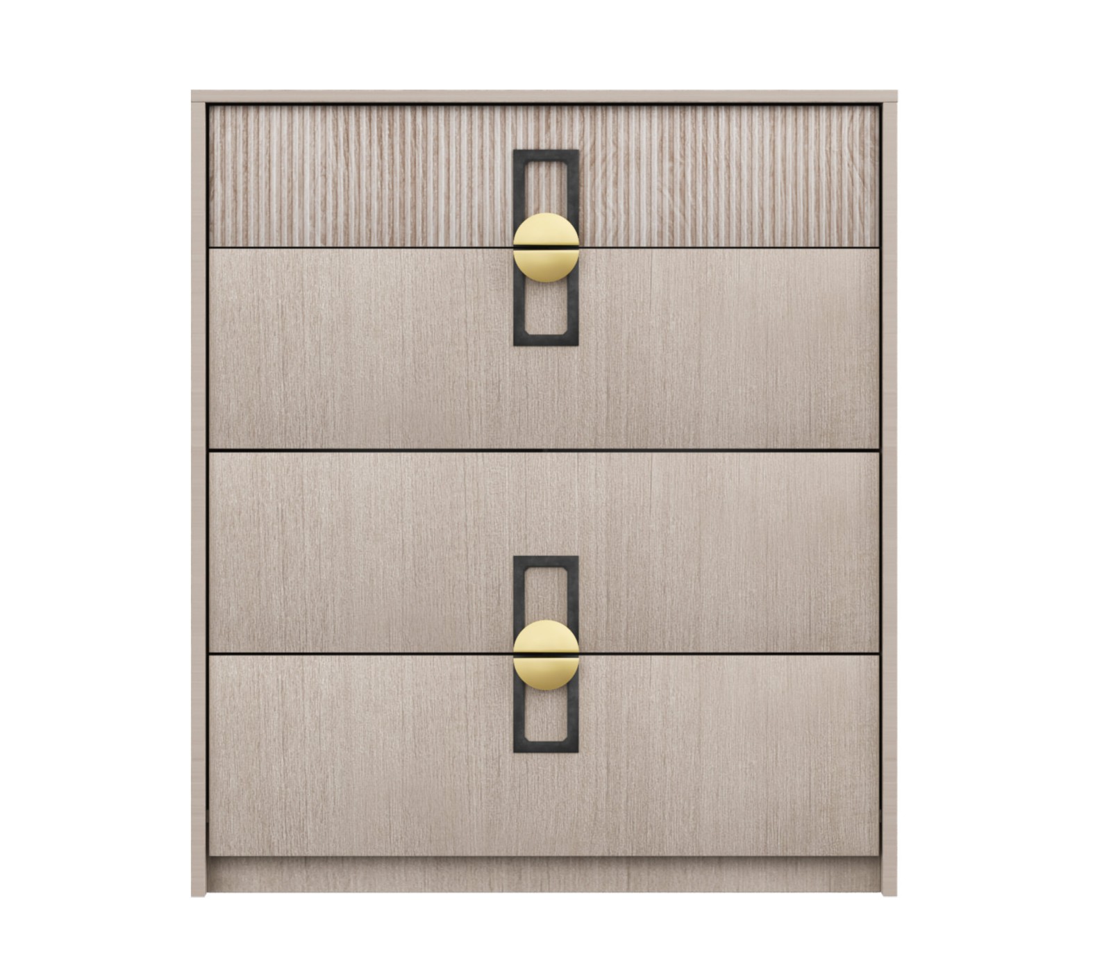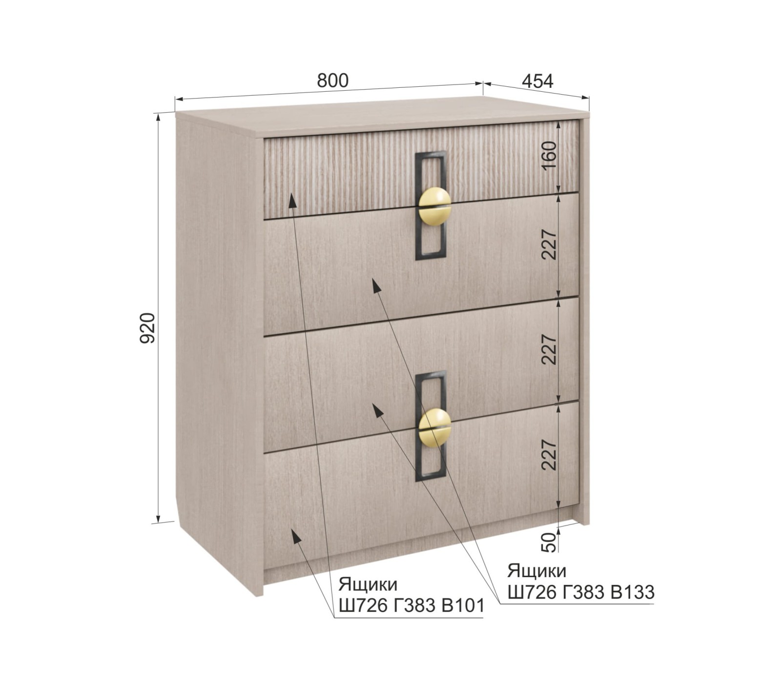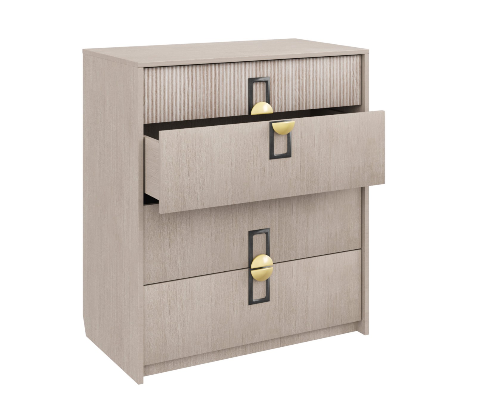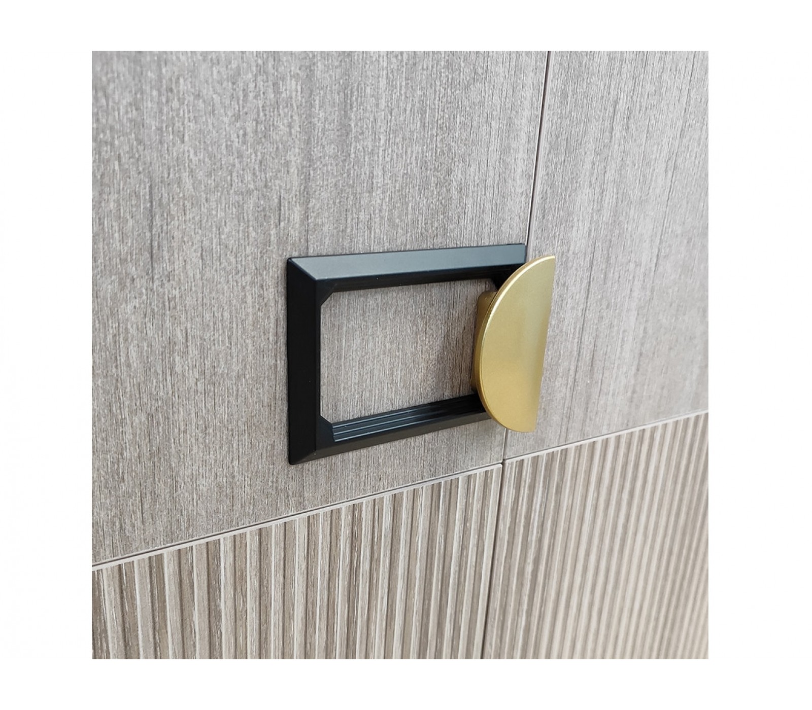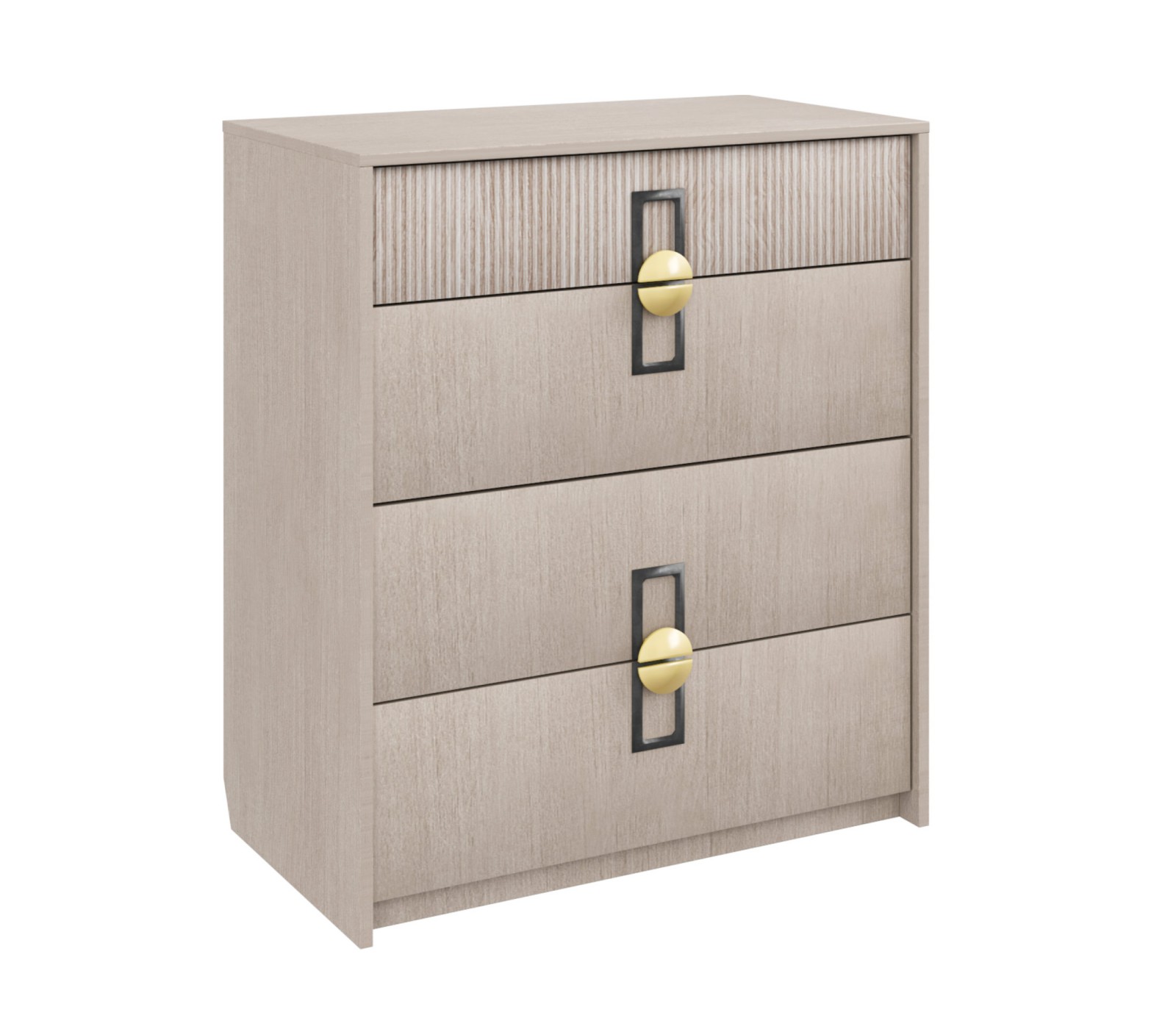 Материал ЛДСП в цвете Кадена вуд, фрезерованная отделка Тира. Направляющие скрытые с нижним креплением плавного хода. Ручка матовая золото/черный цвет. Комод ставится на подпятники без регулируемых ножек.