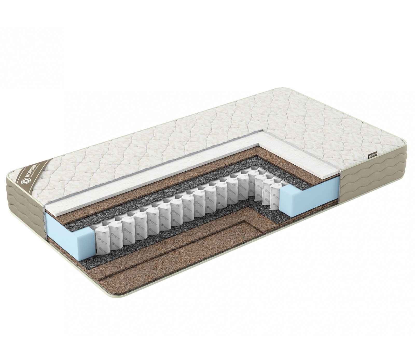 Разносторонняя модель с чехлом из льняного трикотажа. Двойной слой кокосовой койры с жесткой стороны матраса придает спальному месту ровность и упругость, что подойдет тем, кто привык спать в «спартанских условиях». Струттофайбер с одним слоем кокосового волокна с другой стороны будет более комфортным, что позволит подбирать жесткость матраса под потребности пользователя.