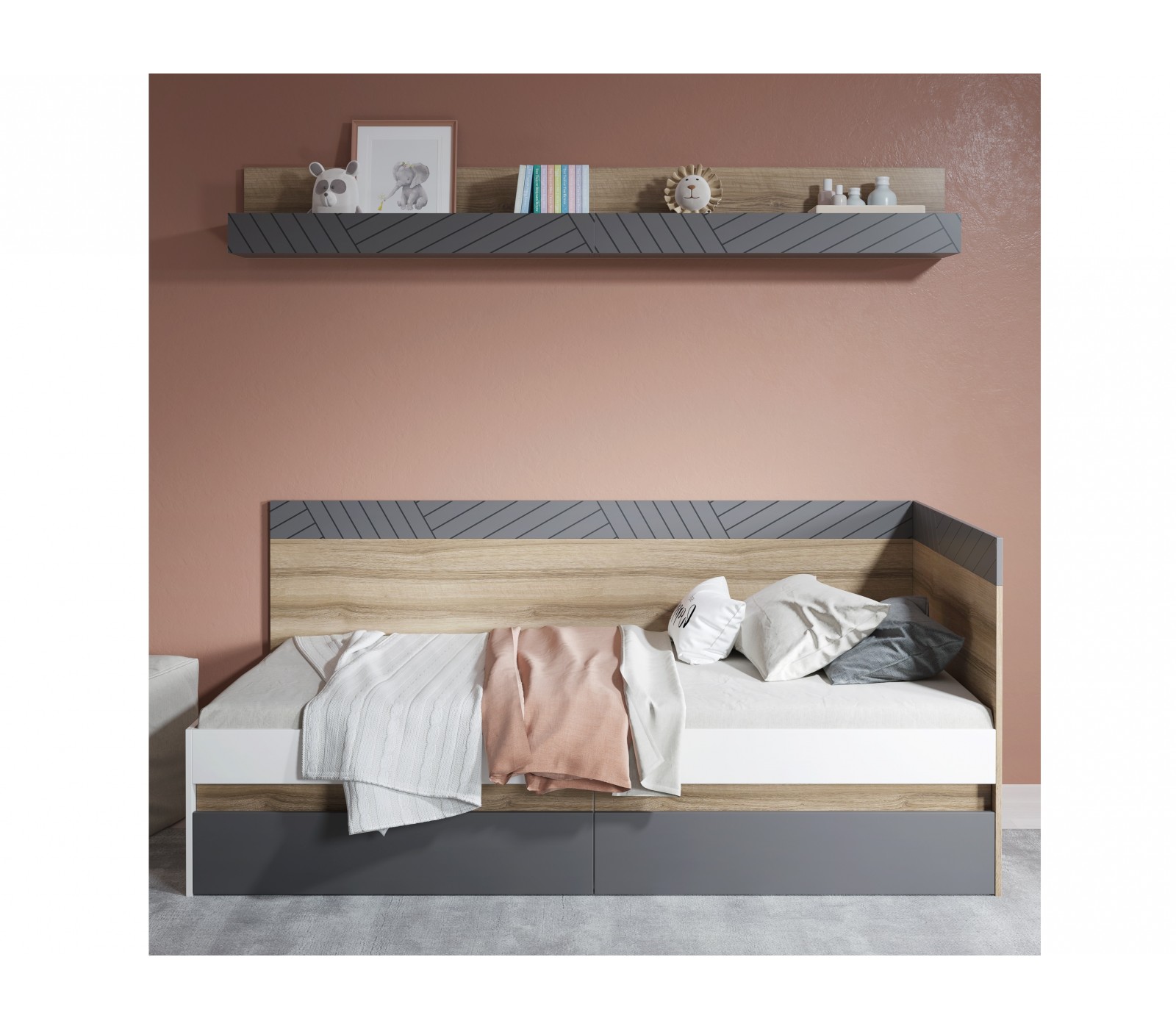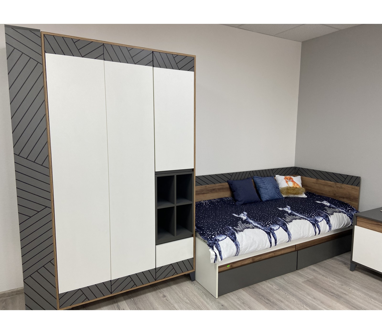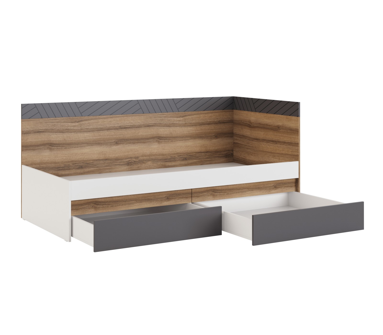 Современная подростковая Гринвич. Кровать из ЛДСП в сочетании цветов дерева, темно-серого и белого. Два выкатных ящика для хранения вещей. Кровать имеет жесткое основание с несущей нагрузкой 150 кг.