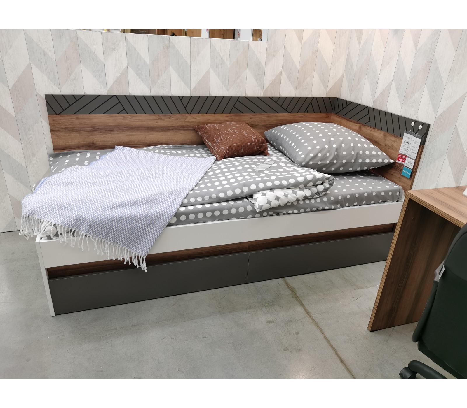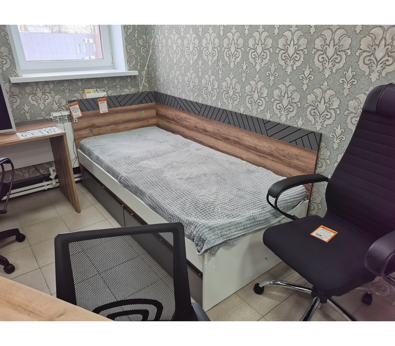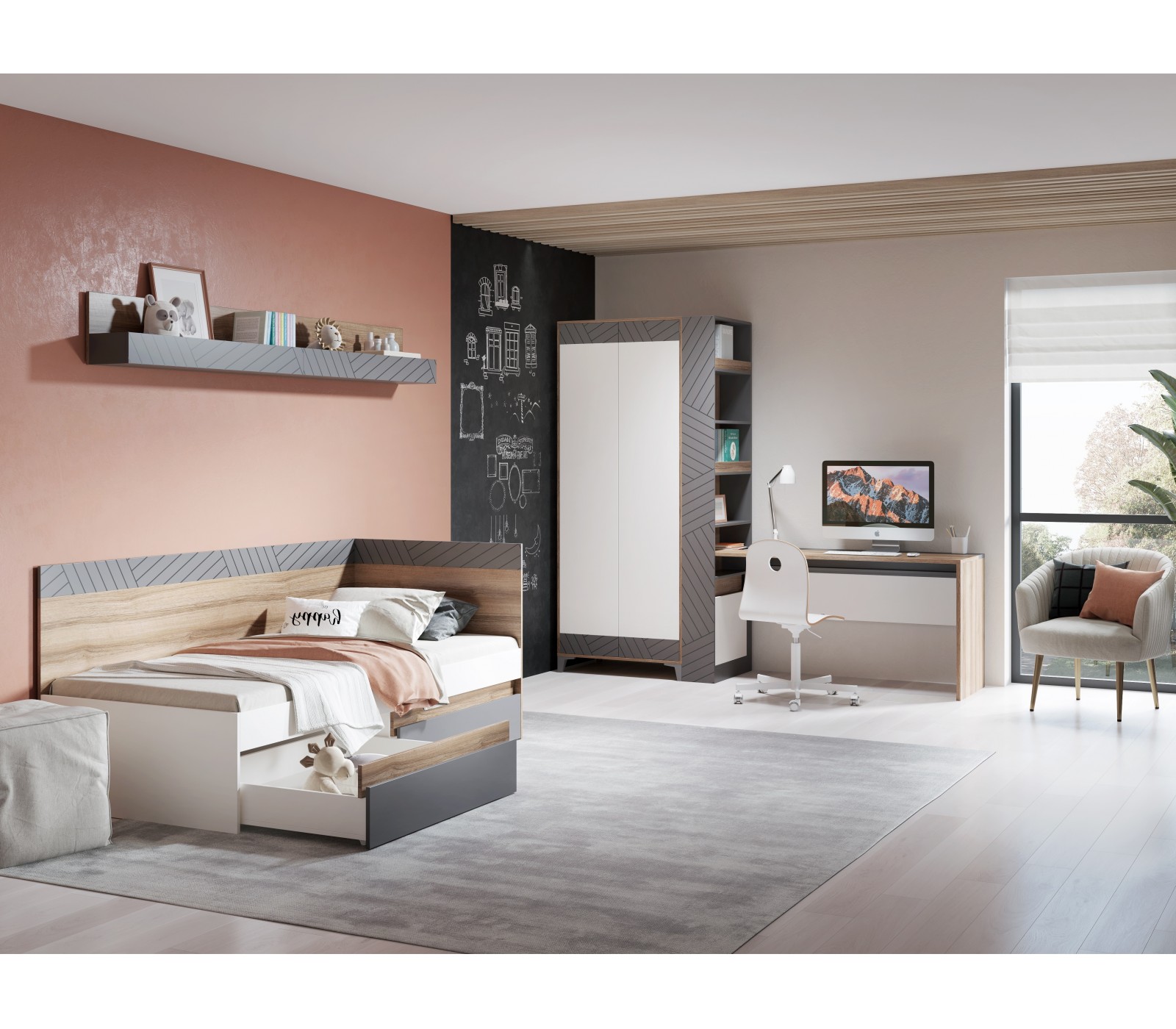 Современная подростковая Гринвич. Кровать из ЛДСП в сочетании цветов дерева, темно-серого и белого. Два выкатных ящика для хранения вещей. Кровать имеет жесткое основание с несущей нагрузкой 150 кг.