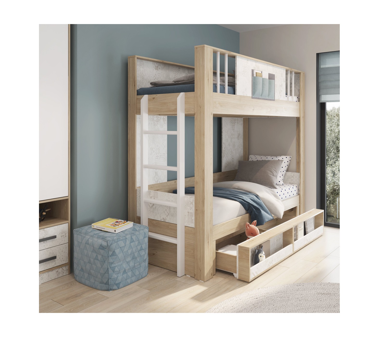Комплектуется лестницей, изготовленной из массива древесины, окрашенной эмалью белого цвета (Ral 9016). Возможна комплектация кровать подиум и карманом для хранения.