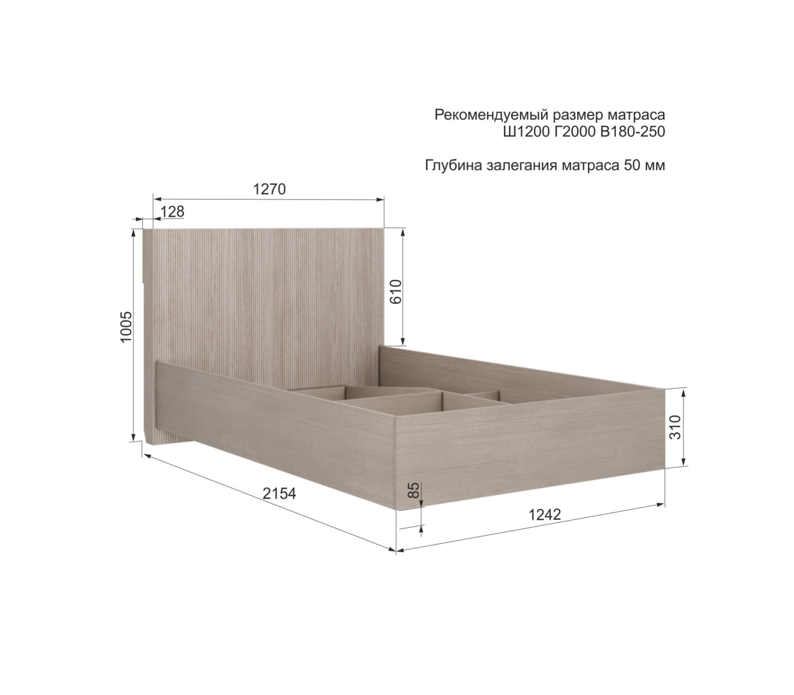 Габариты кровати: Спинка шириной 1270 мм., основание 1242 мм. Глубина 2154 мм. Высота: 1005 мм.