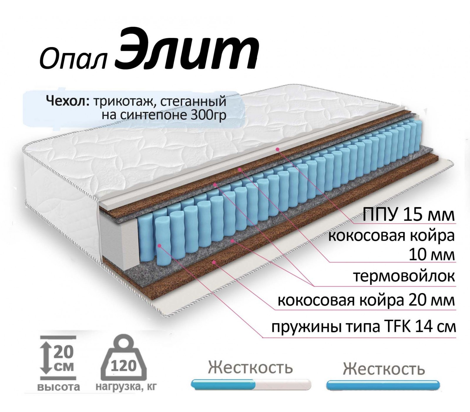 Двусторониий матрас разной жесткости на основе блока независимых пружин TFK с использованием латексированной кокосовой койры с обеих сторон. Одна сторона с ярко выраженным ортопедическим эффектом, и более жесткая, упругая вторая сторона. Подойдет людям, ведущим активный образ жизни.