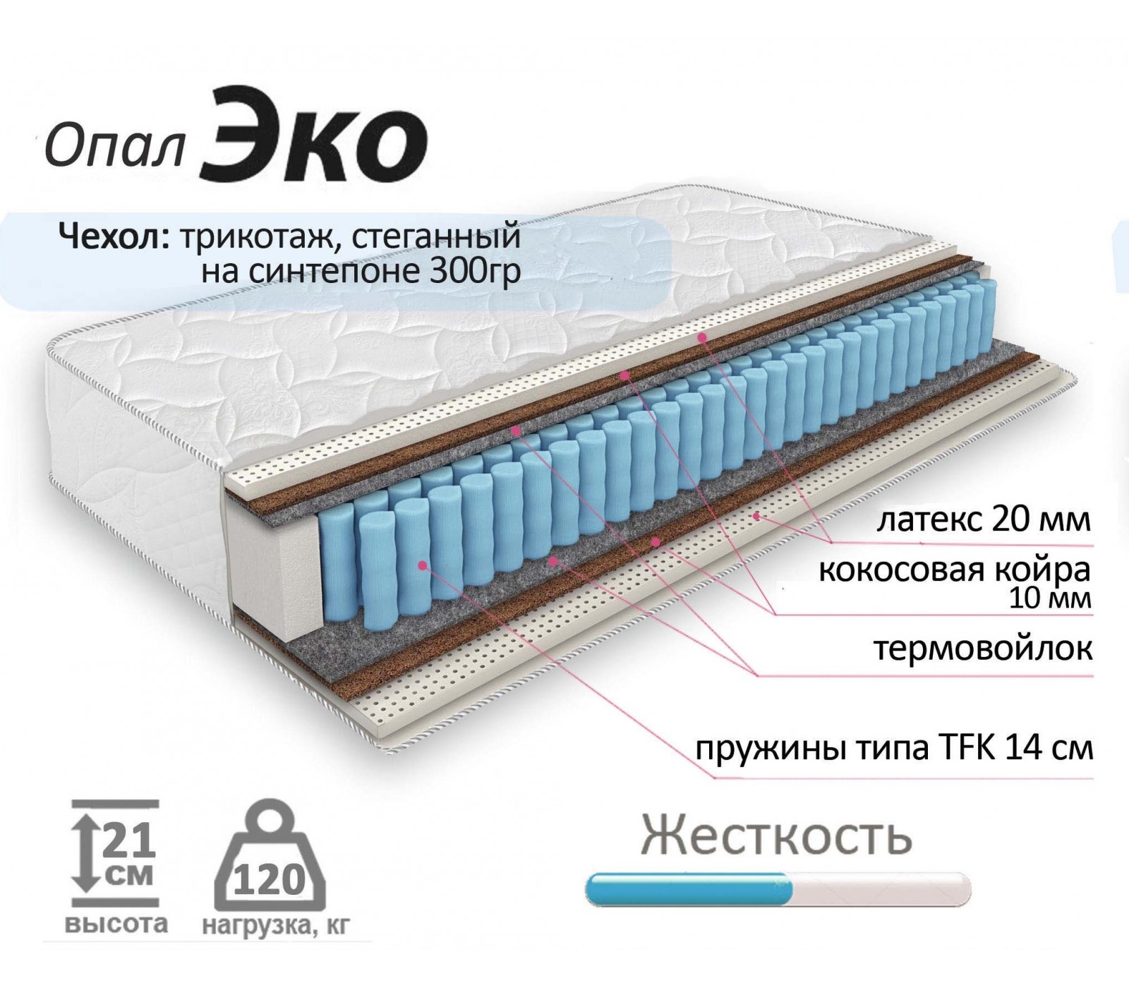 Данный матрас на основе независимого пружинного блока TFK создан из абсолютно природных материалов, таких как кокосовая койра и латекс, который в свою очередь производится из вспененного сока дерева гевеи. Опал Эко относится к матрасам средней жесткости повышенной комфортности.