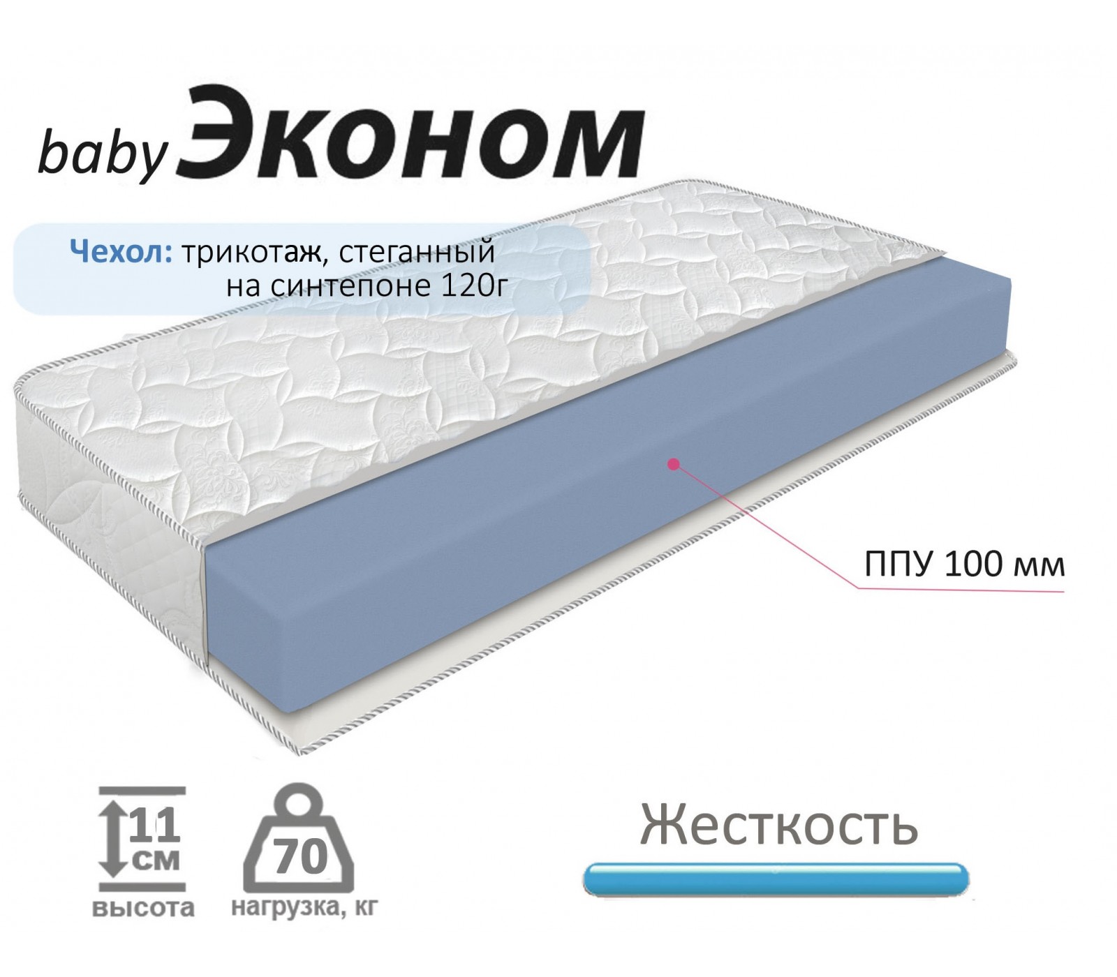 Доступный по цене матрас для детей на основе гипоаллергенного материала ecofoam в чехле из трикотажа, стеганного на синтепоне, жесткий. Рекомендованная нагрузка до 70 кг.