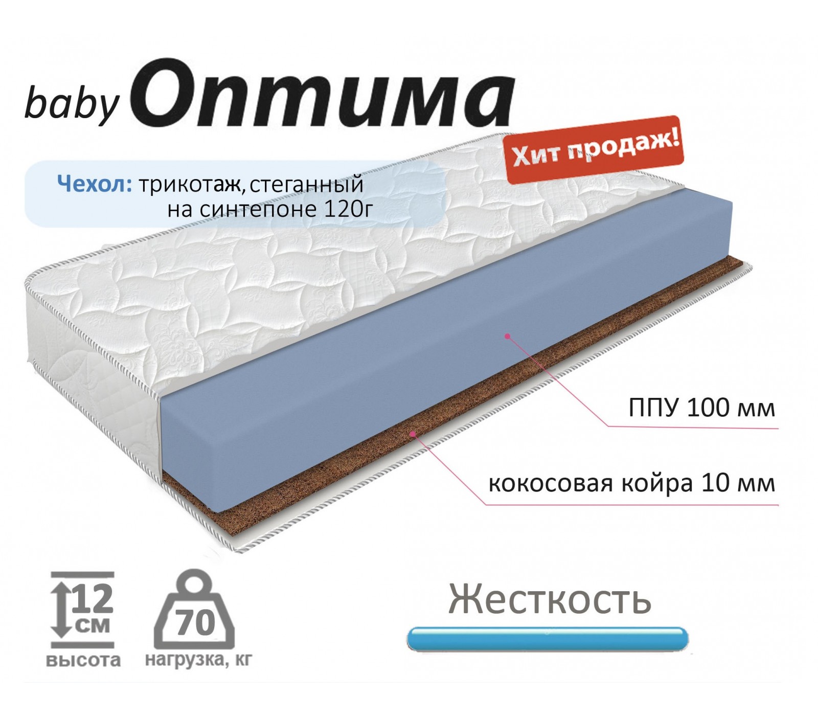 Уникальное сочетание материалов матраса оптима позволяет достичь наиболее комфортного сна для Ваших детей. Основа экологичный материал ecofoam и дополнительный слой из натуральной кокосовой койры для увеличения жесткости данного матраса в чехле из трикотажа, стеганного на синтепоне. Рекомендованная нагрузка до 70 кг.