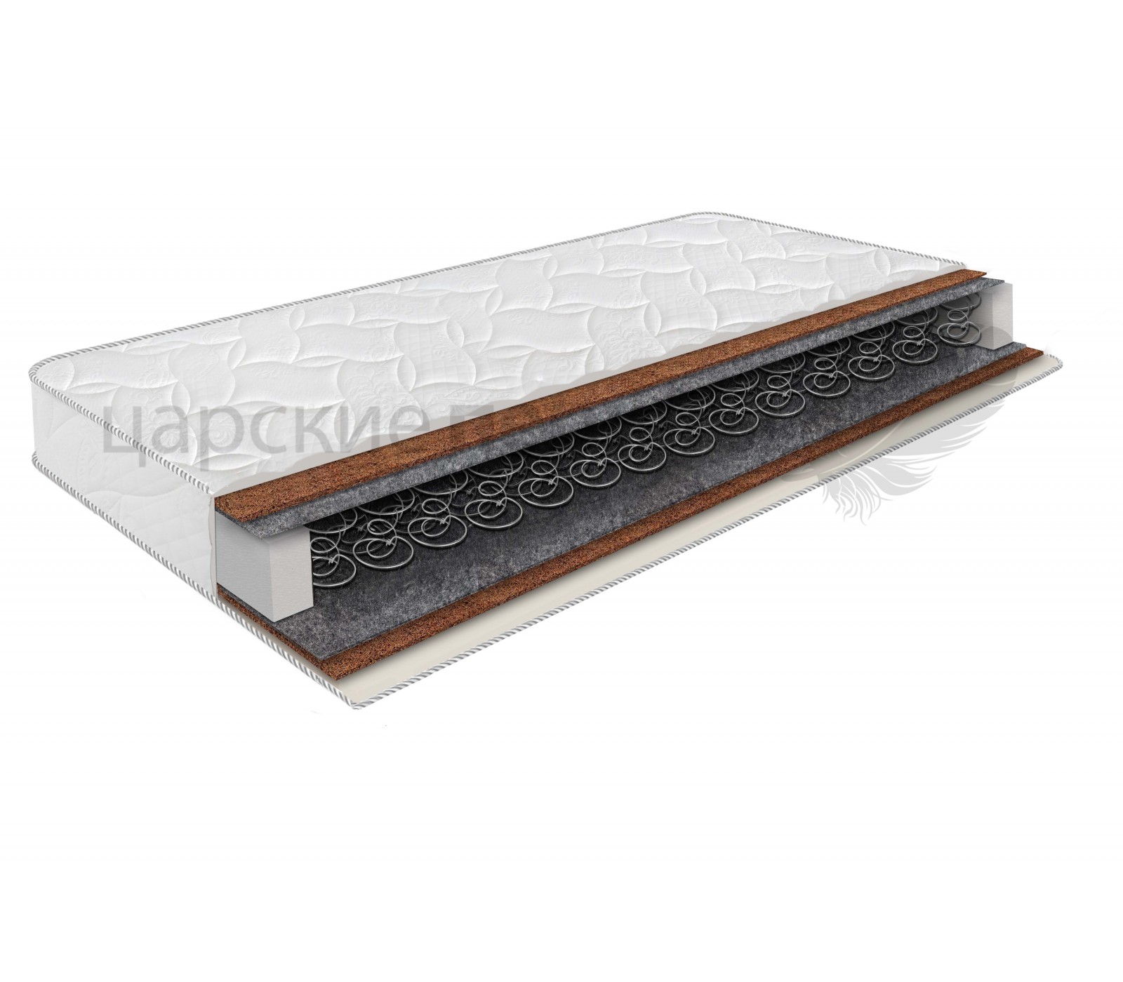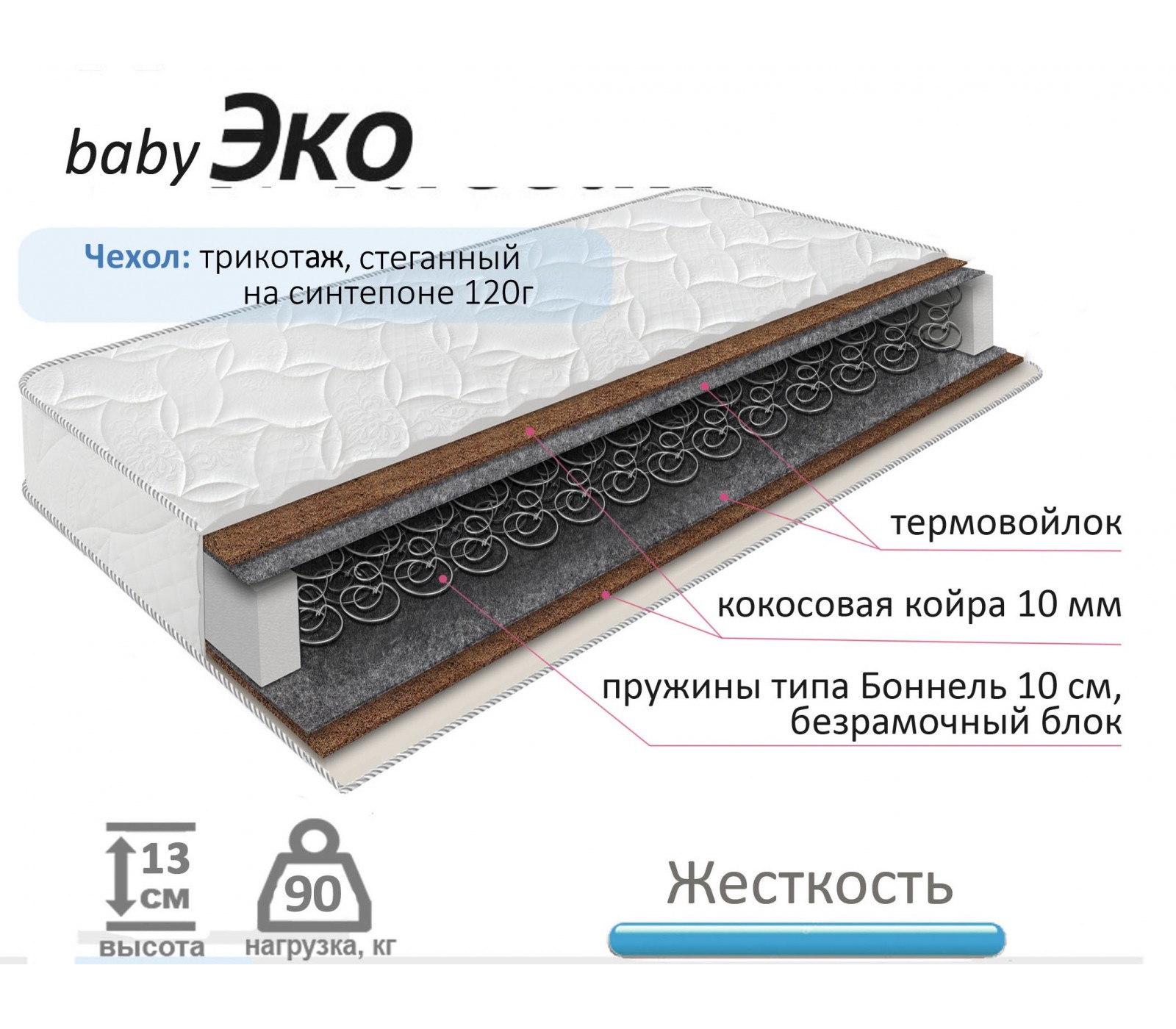Классический детский матрас на основе зависимых пружин типа Боннель с одинаковой степенью жесткости с обеих сторон в чехле из трикотажа, стеганного на синтепоне.. Пружины изолированы термоскрепеленным войлоком, матрас обладает высокими вентиляционными свойствами благодаря использованию в составе матраса натуральной латексированной кокосовой койры. Данный матрас относится к категории жестких матрасов. Рекомендованная нагрузка до 90 кг.