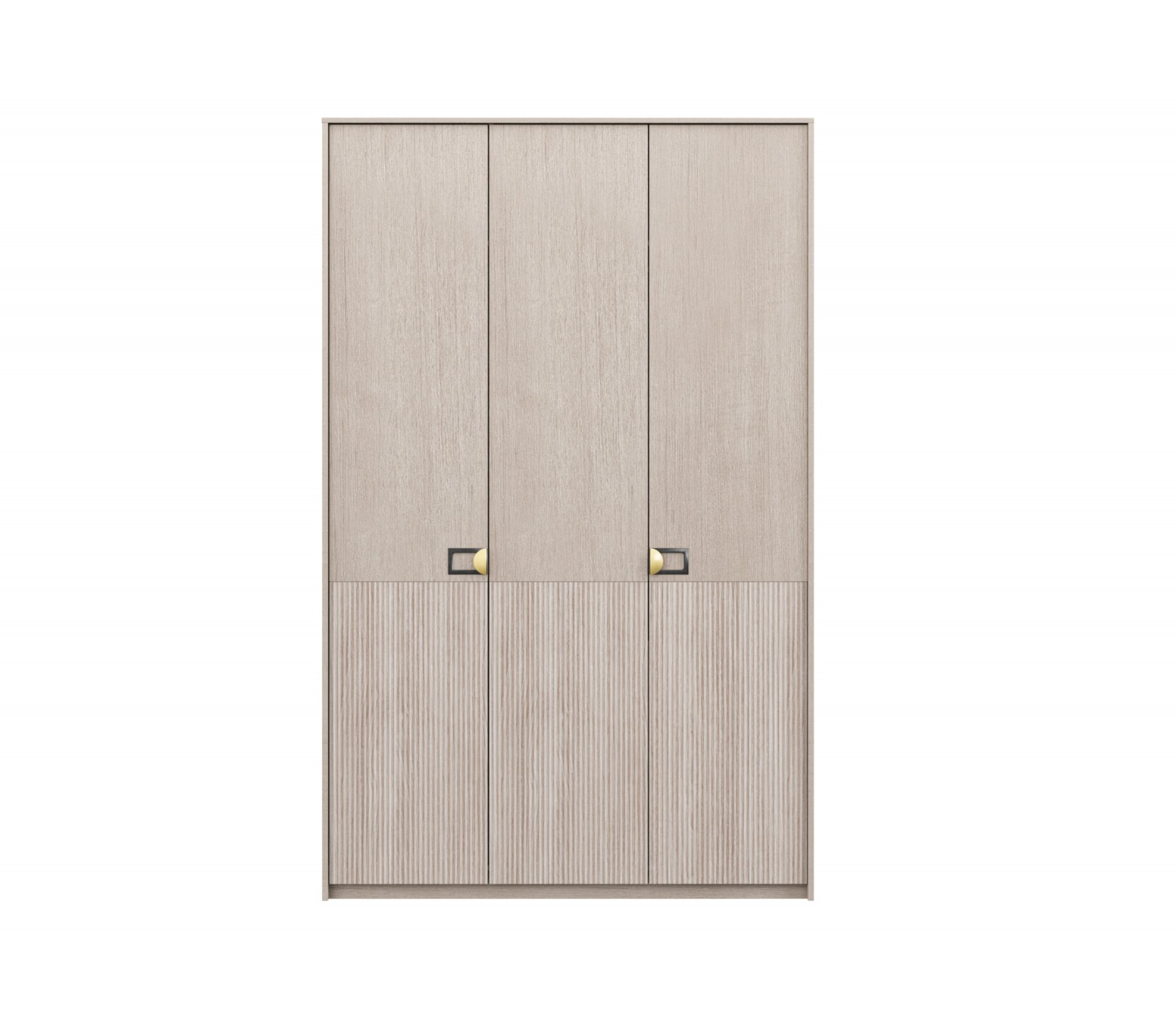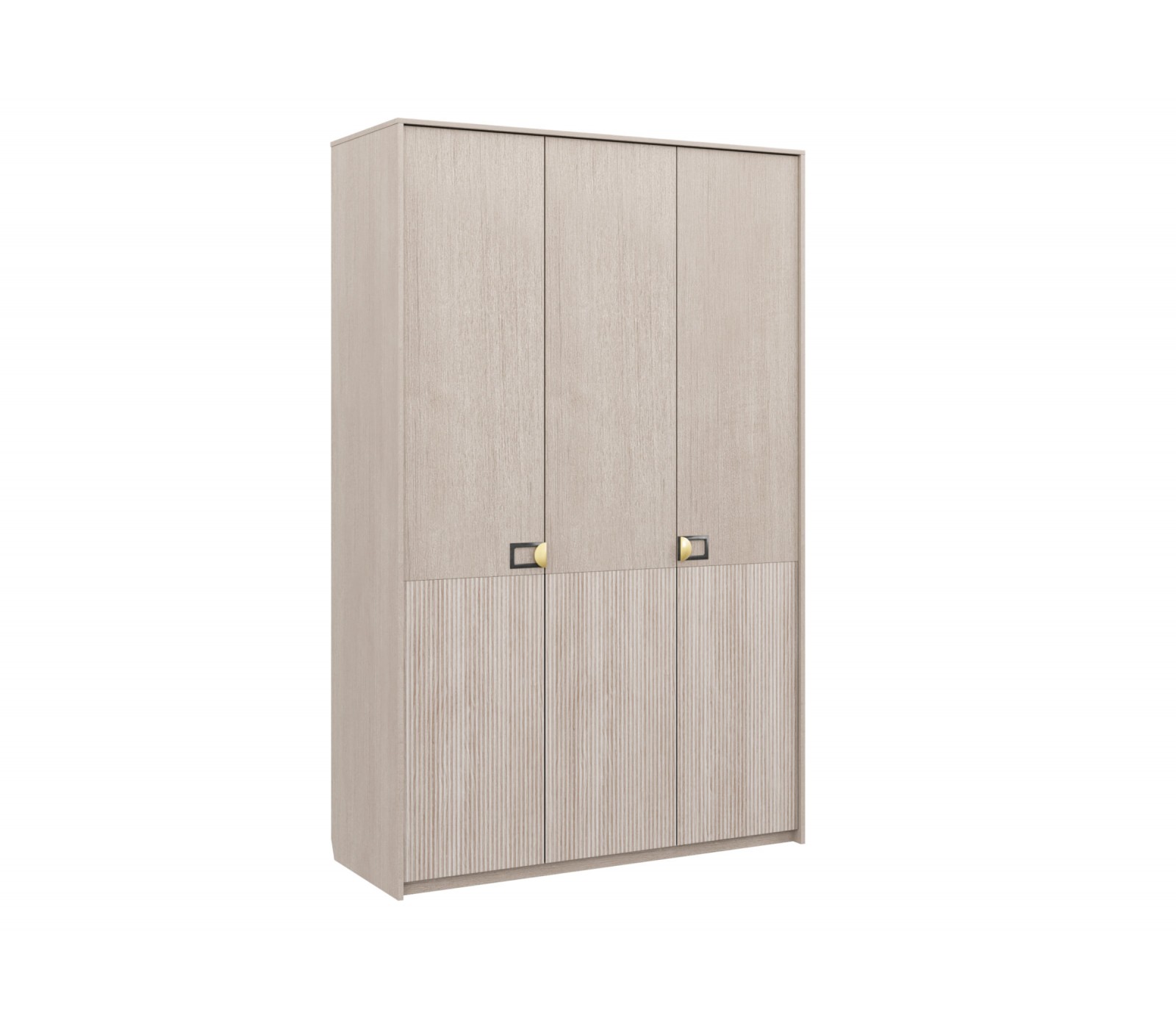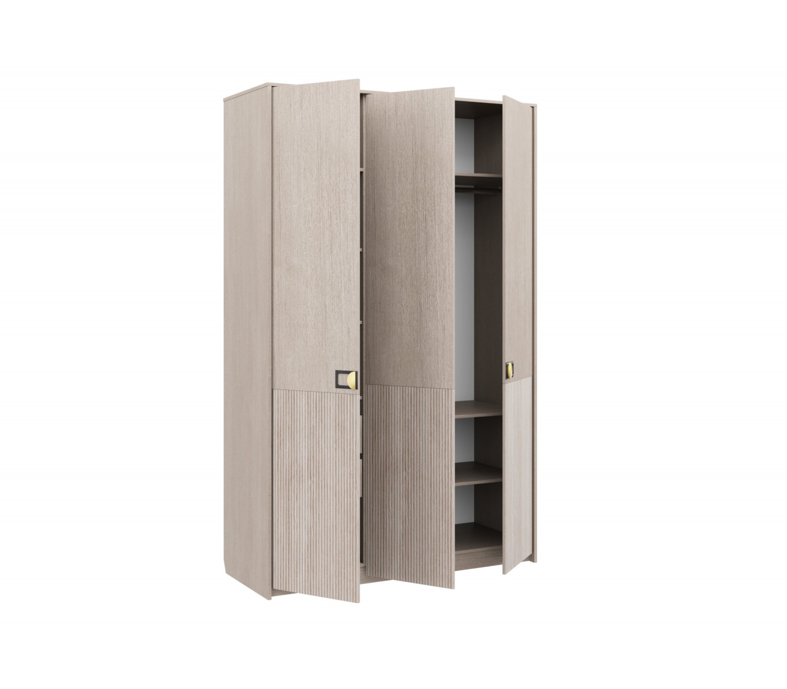 Шкаф распашной трехдверный с выдвижными ящиками стоит на подпятниках. Петли плавного закрывания. Фурнитура ящиков скрытая нижнего крепления. Ручка матовая золото/черный цвет. Декоры Тира/Кадена вуд.