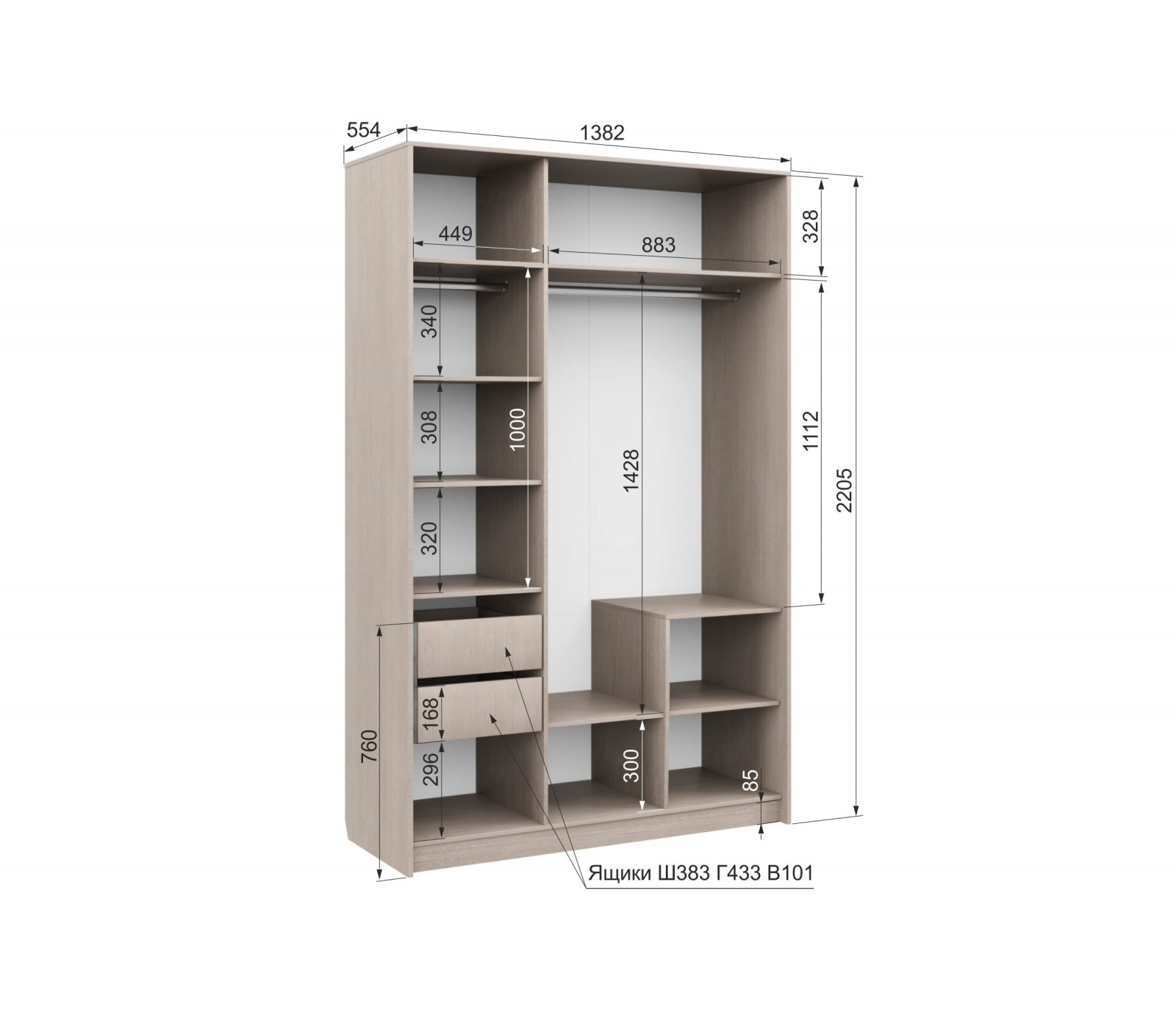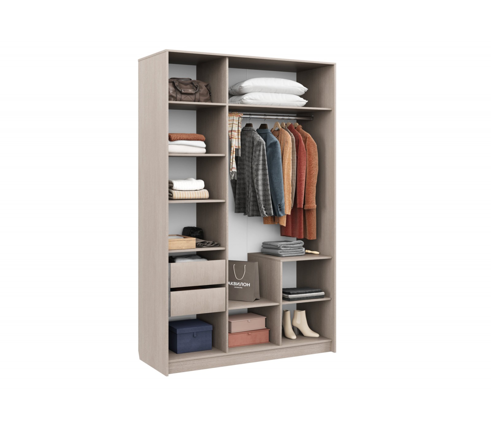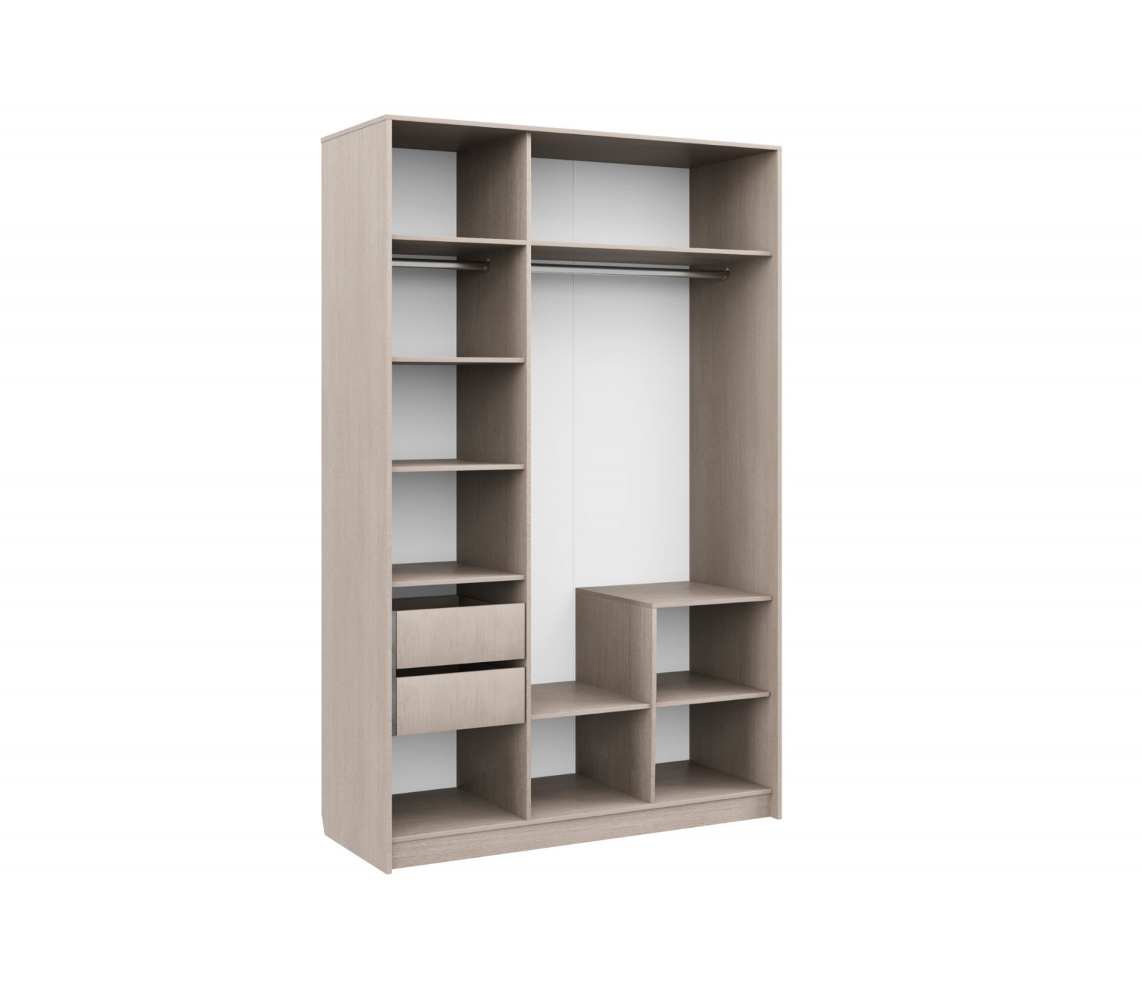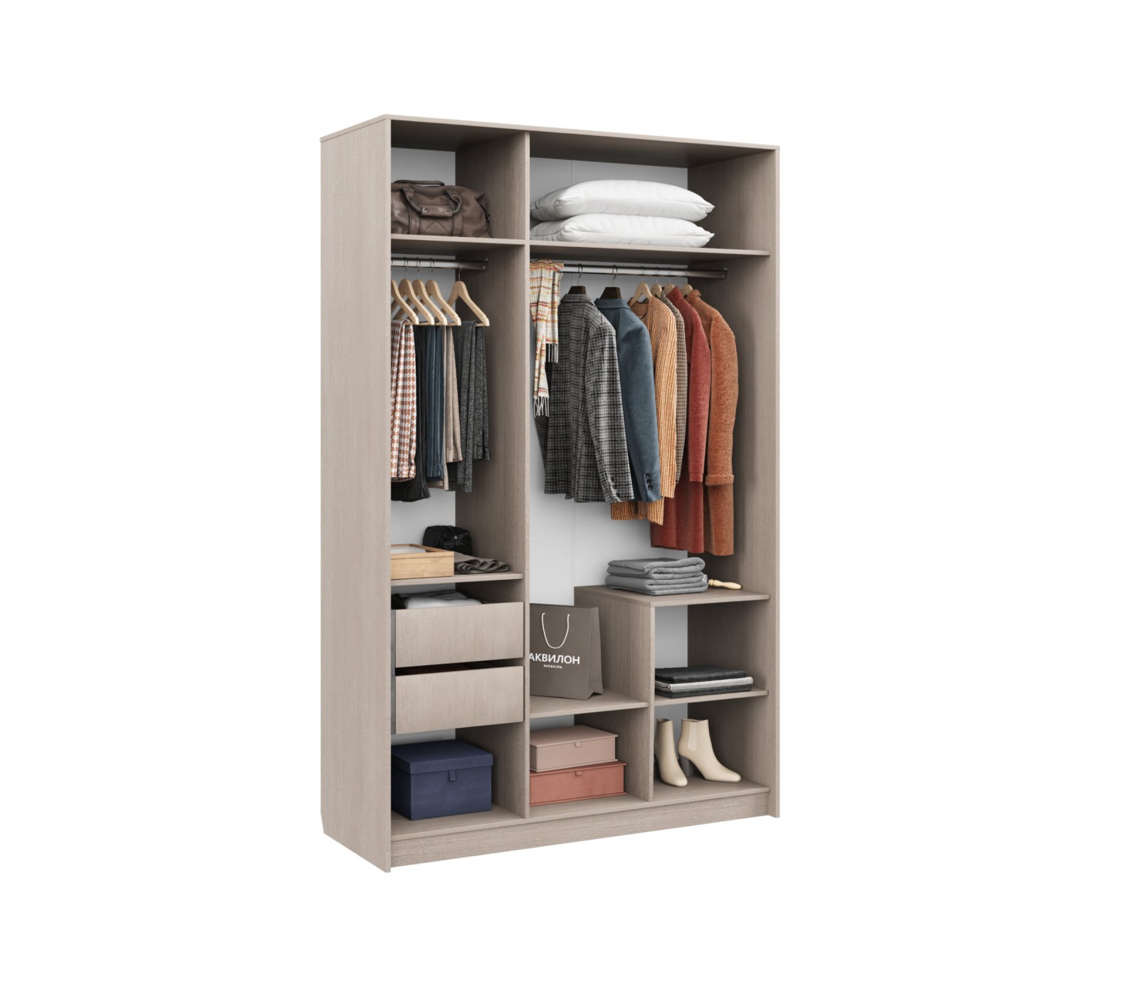 Шкаф распашной трехдверный с выдвижными ящиками стоит на подпятниках. Петли плавного закрывания. Фурнитура ящиков скрытая нижнего крепления. Ручка матовая золото/черный цвет. Декоры Тира/Кадена вуд.