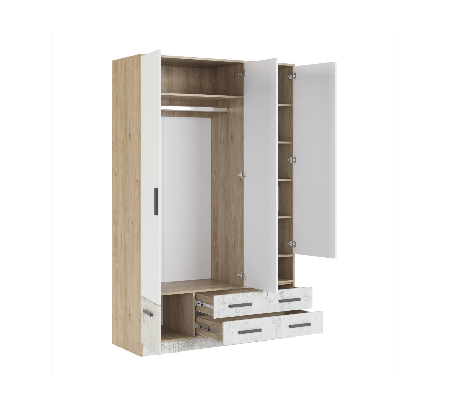 Шкаф имеет два распашных фасада, два выдвижных ящика на шариковых направляющих полного выдвижения и открытую нишу.