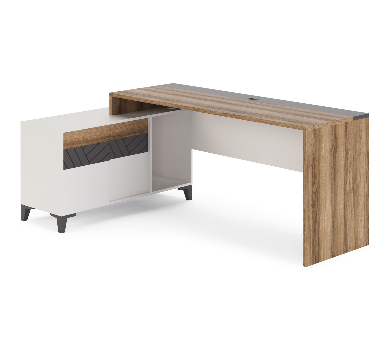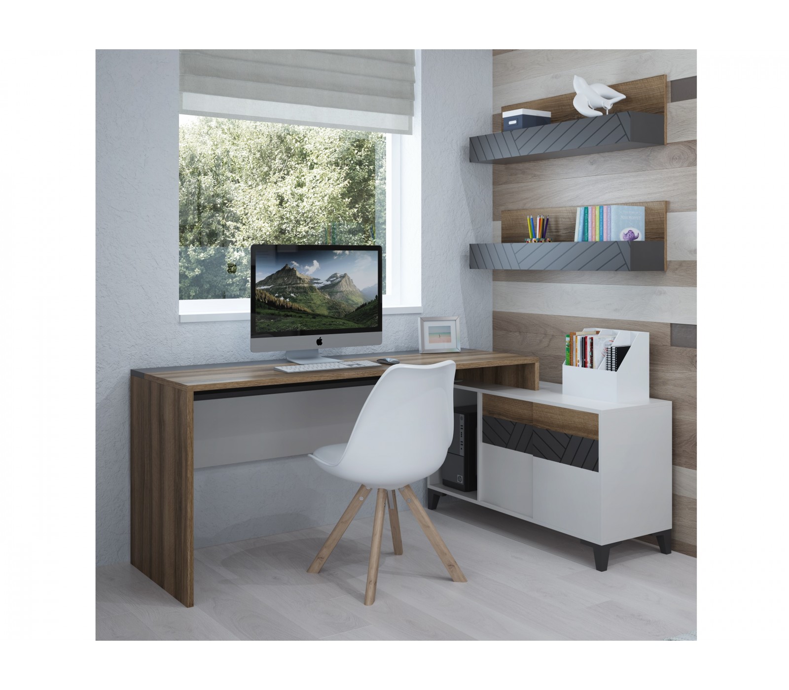Современная подростковая Гринвич. Письменный стол цвета дерева в сочетании с большой тумбой с левой стороны. Ножки тумбы выполнены из массива дерева.