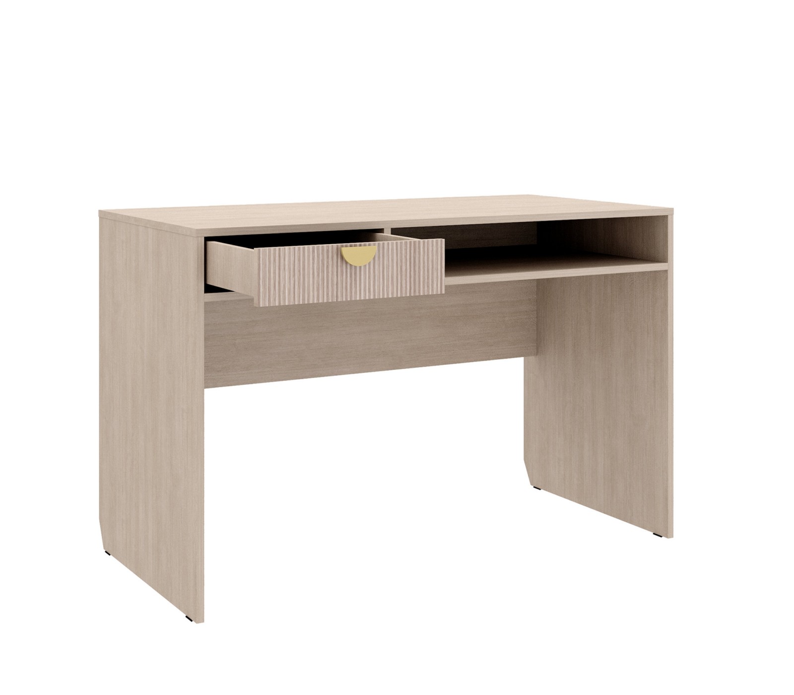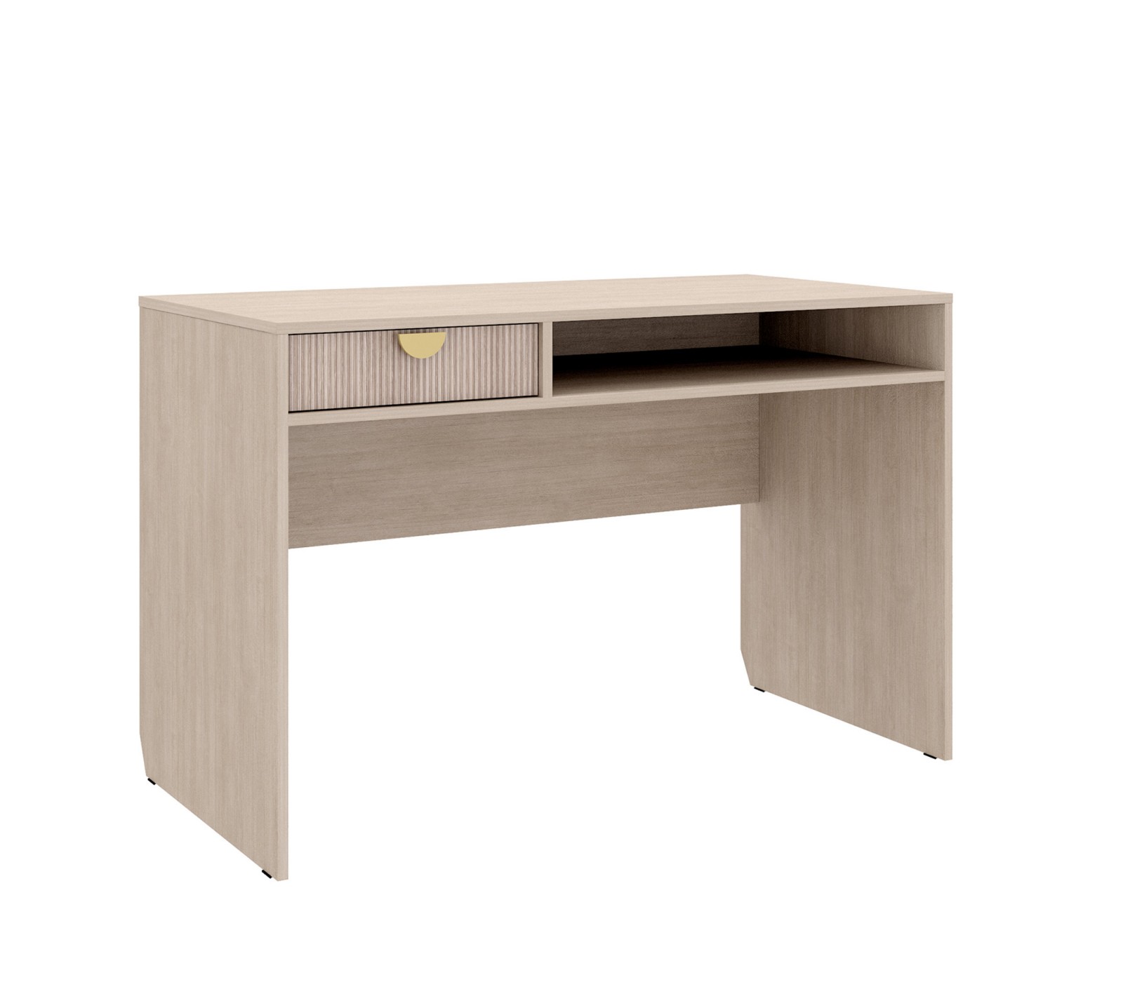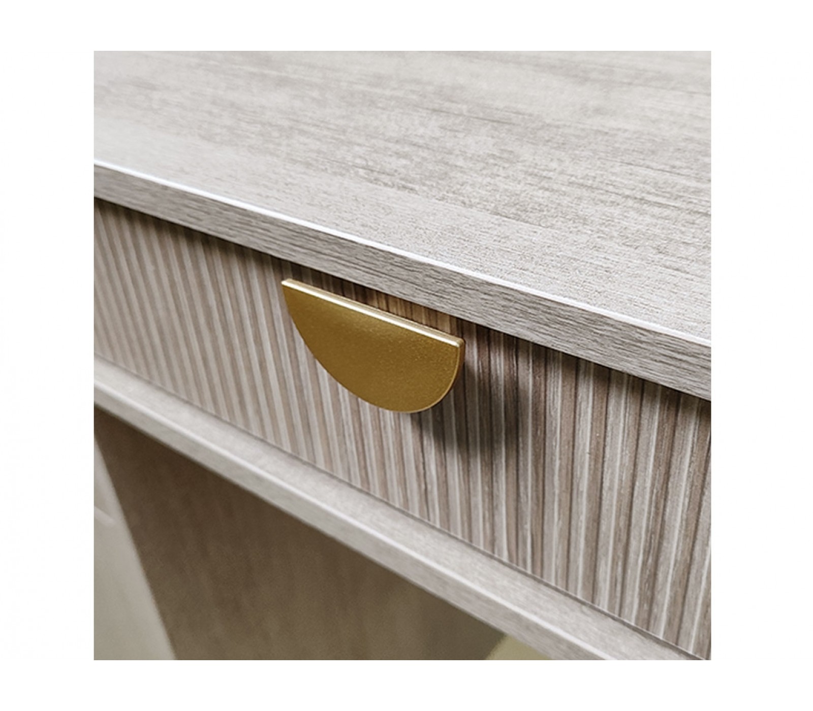 Корпус ЛДСП 16. Фасады рифленые. Ручка матовое золото. У ящика фурнитура скрытая плавного закрывания с нижним креплением.