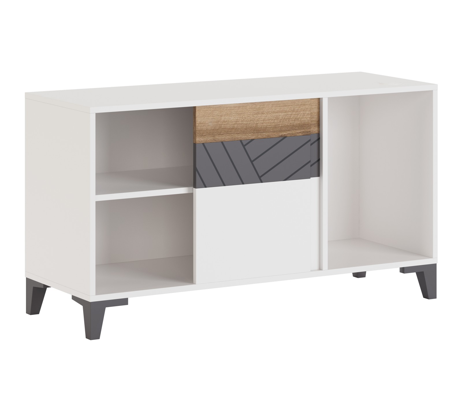 Современная подростковая Гринвич. Тумба прикроватная из ЛДСП в сочетании цветов дерева, белого и темно-серого. Ножки выполнены из массива дерева.