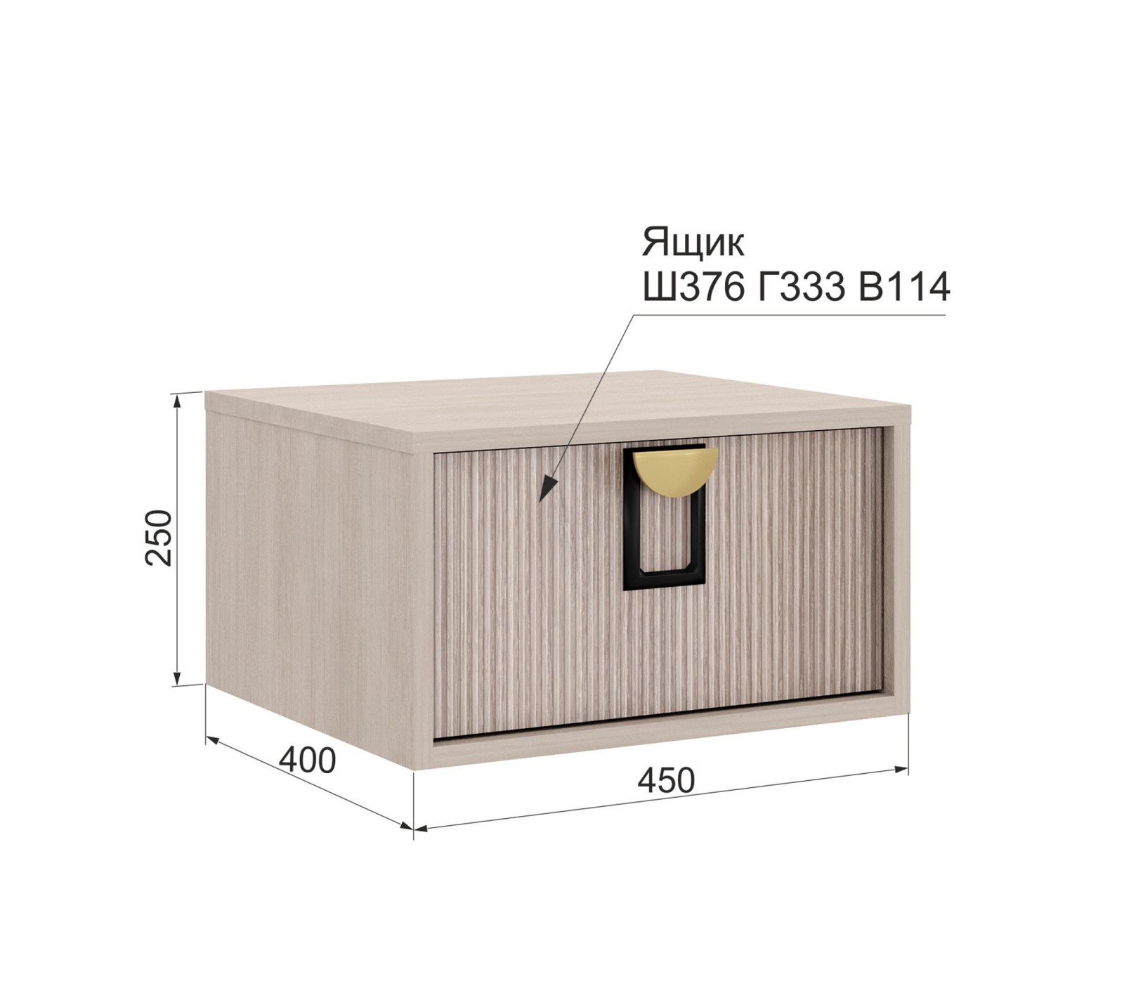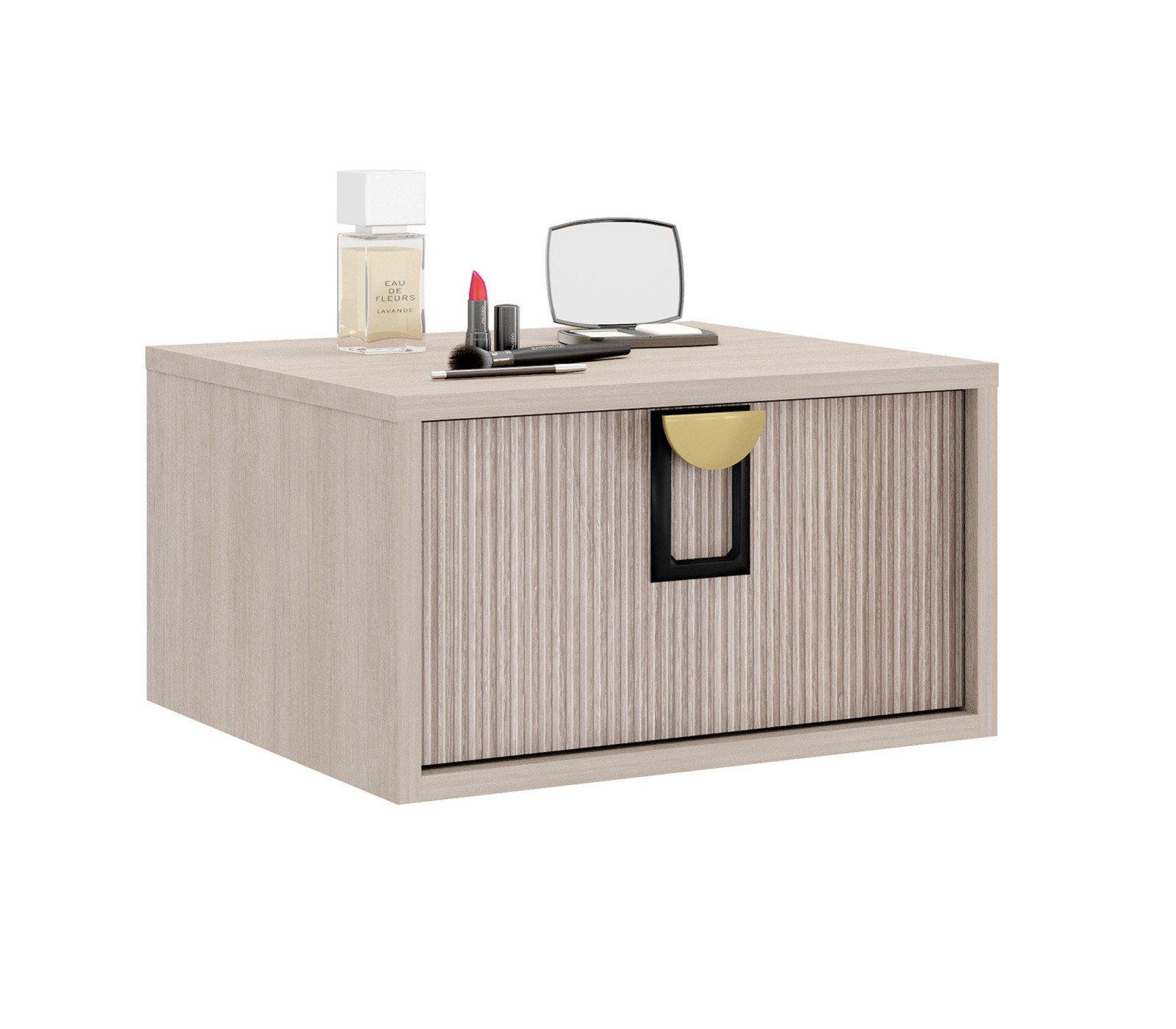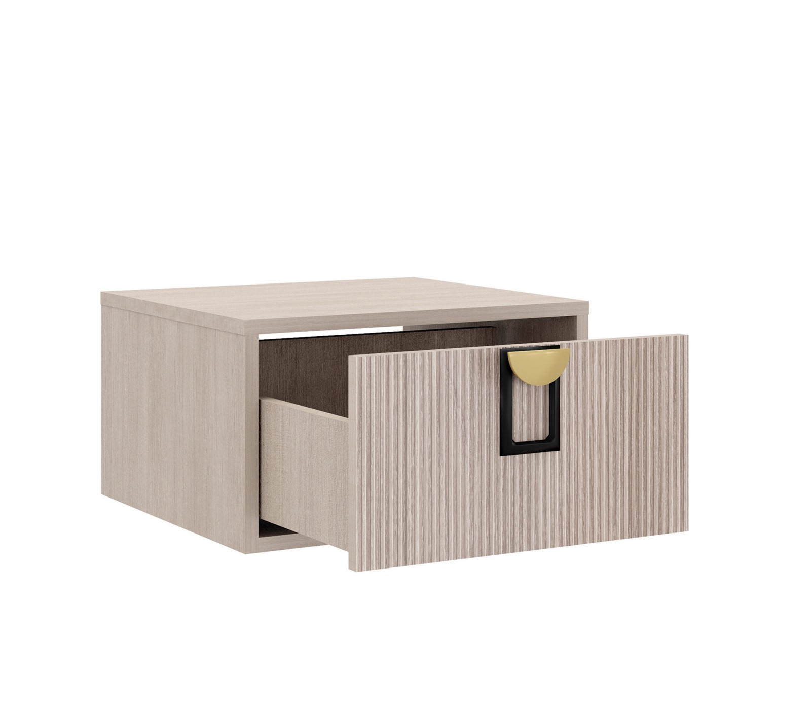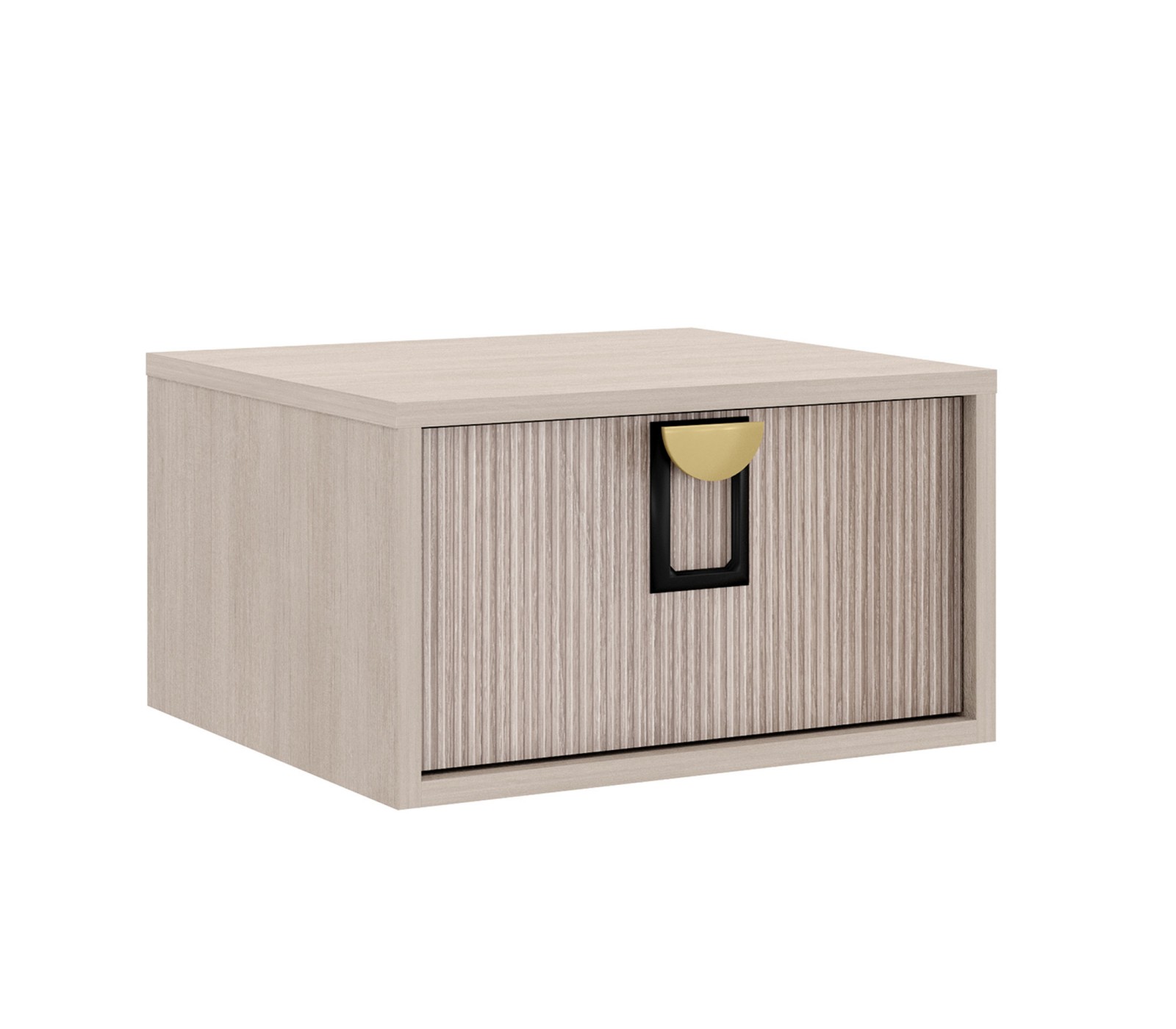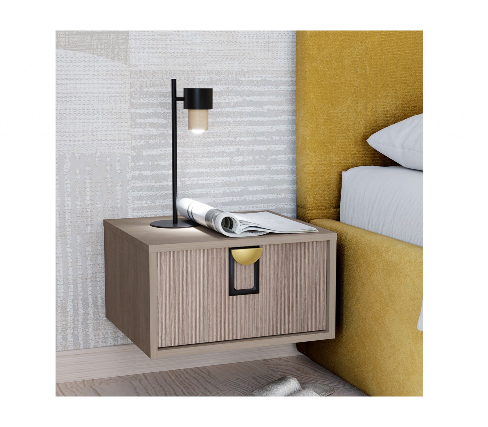 Тумба прикроватная подвесная Муза. Корпус ЛДСП 16 мм. Фасады рифлёные. Ручка матовая золото/черный цвет. Фурнитура плавного закрывания скрытая нижнего крепления.