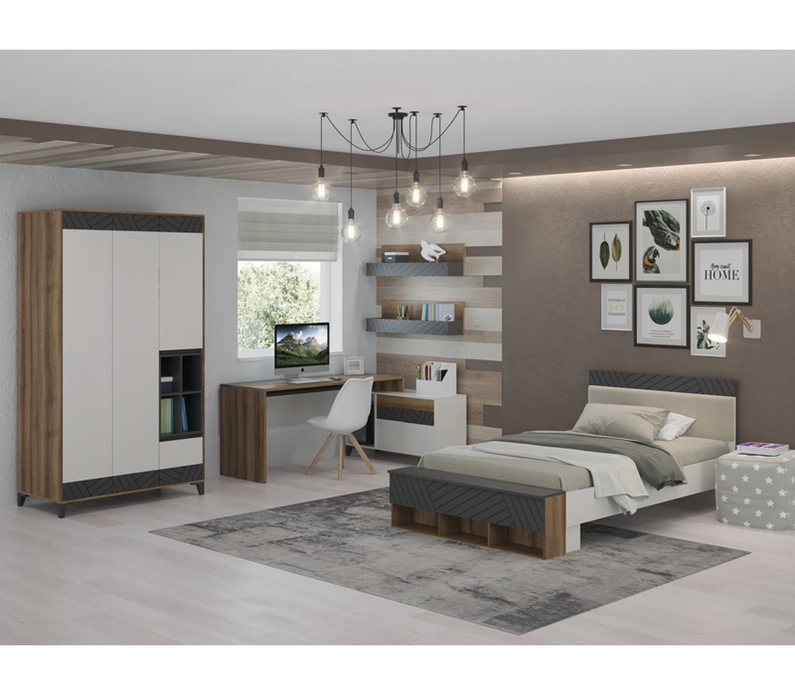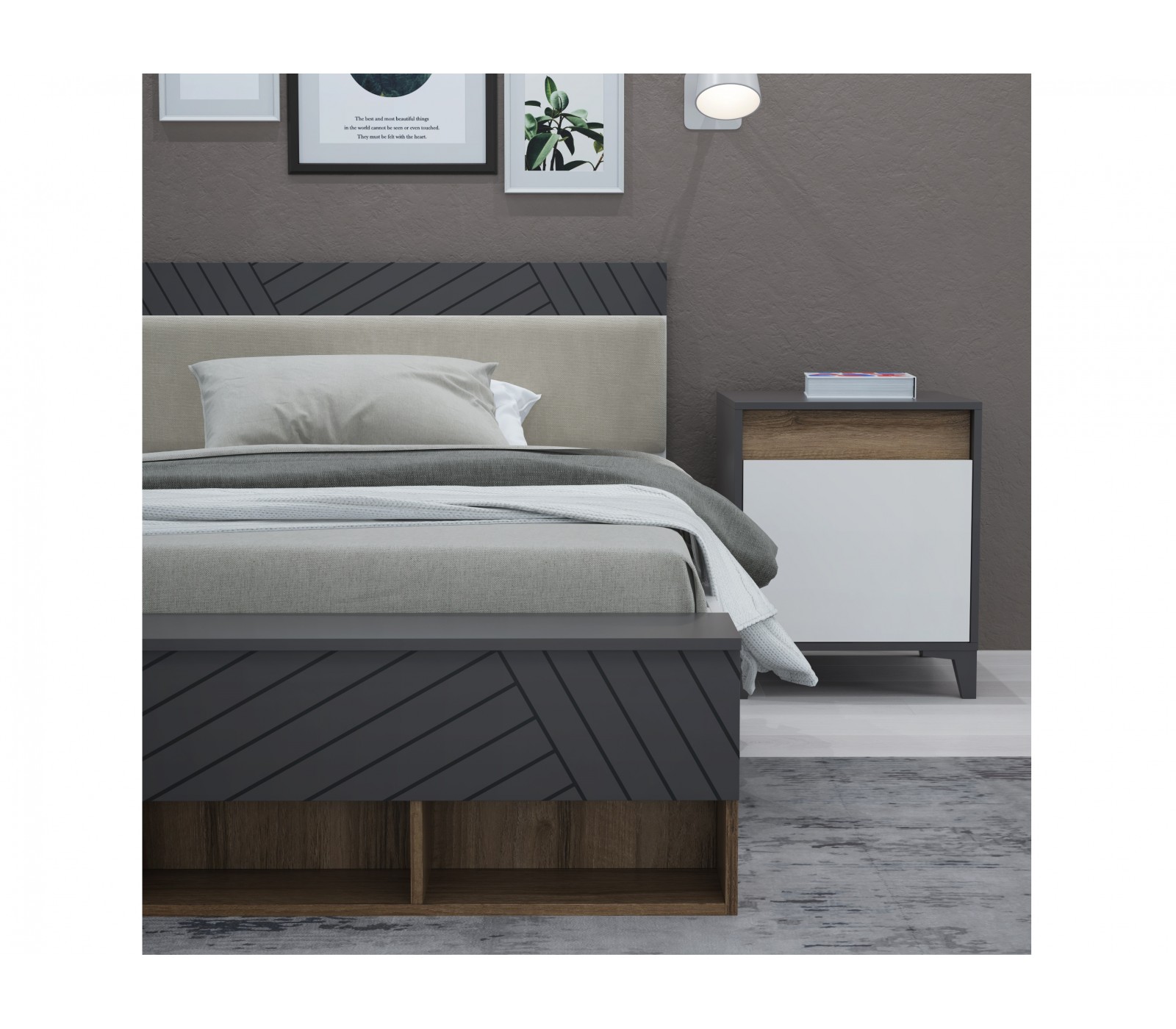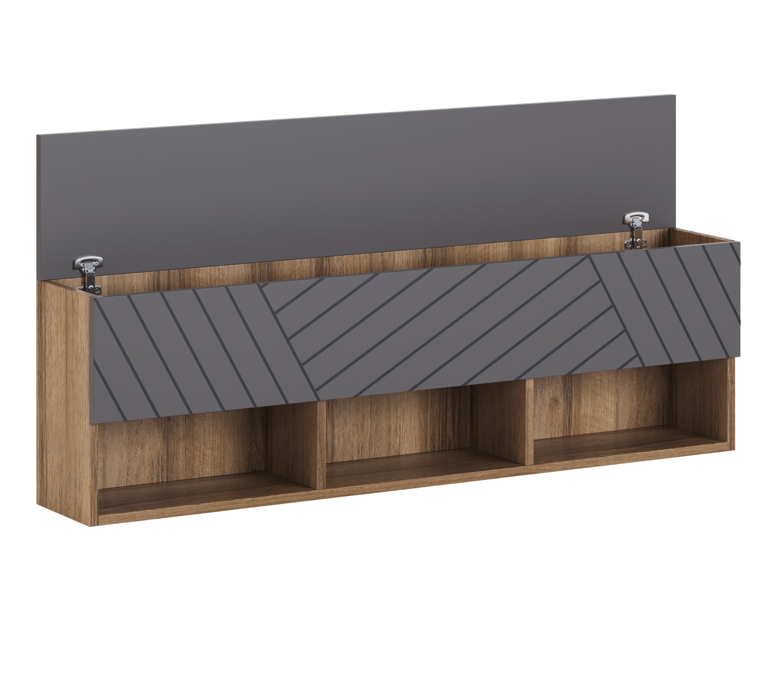Современная подростковая Гринвич. Кровать из ЛДСП в сочетании цветов дерева и темно-серого. Три ящика для хранения вещей открываются сверху. Фурнитура с держателем. Без ножек.